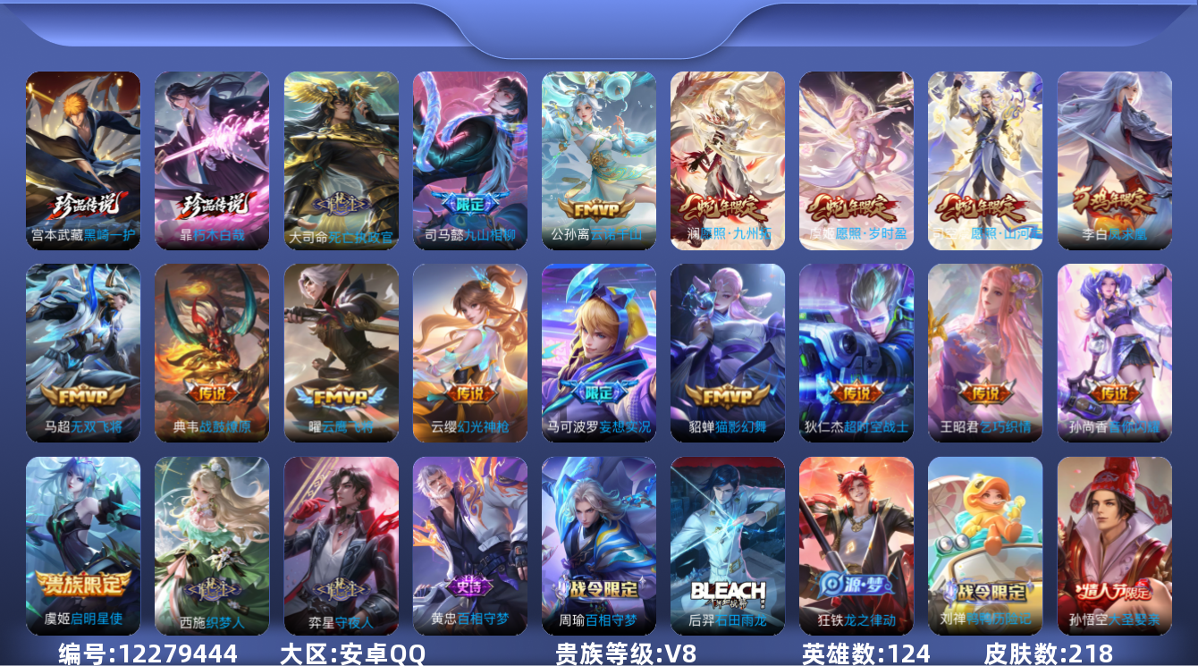 [12279444]V8 2珍品传说 17传说 124英雄 218皮肤 可修改实名 优质装备:朽木白哉,黑崎一护,云鹰飞将(小将军),猫影幻舞,乞巧织情,超时空战士-狄仁杰,无双飞将,音你闪耀(rap皮),妄想实况 传说皮:典韦战鼓燎原,死亡执政官,九山相柳,云诺千山,幻光神枪 珍宝阁皮:妄想食味 限定皮:愿照·九州拓(澜年限),愿照·岁时盈(虞姬年限),愿照·山河定(司空震年限),逐霄战戟,凤求凰(白切鸡),魔法小厨娘,飞衡(韩信年限),山海·碧波行(瑶年限),遇见飞天,降魔,梁祝,天狼征服者,李小龙,大圣娶亲,时之奇旅-妲己 史诗皮:鸭鸭历险记-刘禅,苍鳞隐世,器灵·浮梦炉,狼魂孤将,化蝶舞,龙之律动,石田雨龙,百相守梦-周瑜,茶境仙,琥珀纪元伽罗,百相守梦-百里守约,星界特工,百相守梦-黄忠,织梦人,守夜人,紫霞仙子,黄金分割率,特工魅影,千年之狐,无限星赏官,青蛇,猫狗日记-孙策,乱世虎臣,摇滚巨星,水果甜心,功夫厨神,德古拉伯爵,暗隐猎兽者,鬼剑武藏,地狱岩魂,纤云弄巧,繁星吟游(呼啦呼啦),乘风破浪,逐浪之夏,曙光守护者,热力回旋,箭羽风息,原初追逐者,圣诞狂欢,圣诞恋歌,鹰眼统帅,黎明之约,赏金猎手