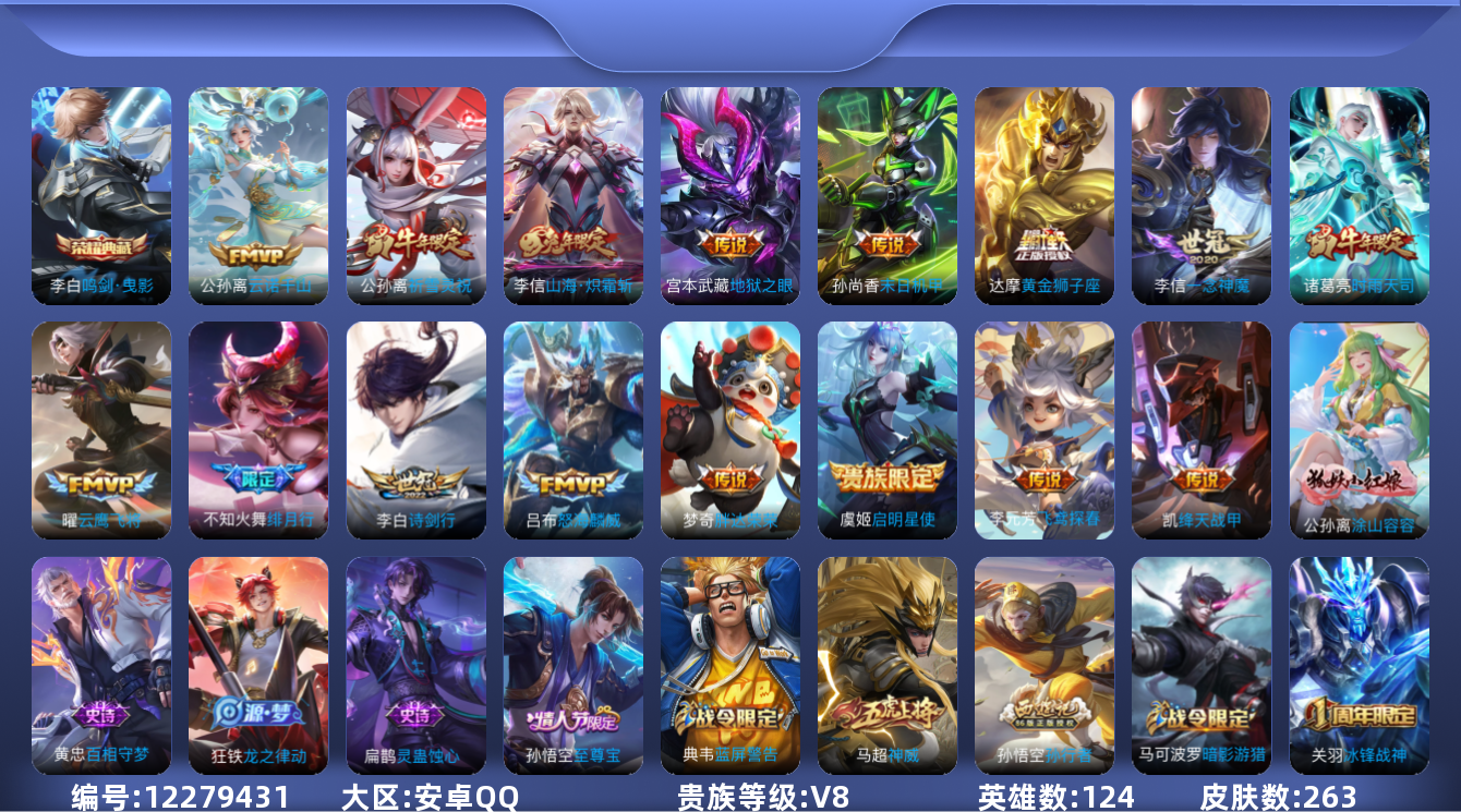 [12279431]V8 1典藏 16传说 124英雄 263皮肤 可修改实名 优质装备:鸣剑·曳影,黄金狮子座,云鹰飞将(小将军),绛天战甲(鸡嘴战神),一念神魔,末日机甲-孙尚香(绿蚂蚱),地狱之眼,飞鸢探春,胖达荣荣,山海·炽霜斩(李信年限),涂山容容 传说皮:云诺千山 珍宝阁皮:女武神,玩趣恶龙 限定皮:至尊宝,傲雪梅枪,绯月行,时雨天司(水龙头),神威(电光马子),山海·碧波行(瑶年限),高山流水,诗剑行,怒海麟威,五谷丰年,冰锋战神,御风骁将(吕布年限),天狼狩猎者,烈魂,天狼溯光者,奔雷神使(牛魔年限),祈雪灵祝(雪兔子),李小龙,朱雀志(守约年限),默契交锋-花木兰,孙行者,猪悟能,一生所爱,引擎之心,神奇女侠,山海·玄木吟(马可年限) 史诗皮:化蝶舞,灵蛊蚀心,龙之律动,百相守梦-黄忠,紫霞仙子,黄金分割率,永昼,雪夜绮愿(周瑜),魅语,蒙恬荣光圣徽,冰冠公主,偶像歌手,晚萤,暗夜猫娘,乱世虎臣,节奏热浪,修罗,女仆咖啡,水果甜心,绅士熊喵,天才门将,星夜王子,功夫厨神,德古拉伯爵,暗隐猎兽者,幽灵船长,鬼剑武藏,心灵战警,地狱岩魂,纤云弄巧,繁星吟游(呼啦呼啦),缤纷独角兽,乘风破浪,逐浪之夏,水晶猎龙者,箭羽风息,金属风暴,原初追逐者,圣诞恋歌,鹰眼统帅,魅力维加斯,赏金猎手,无心