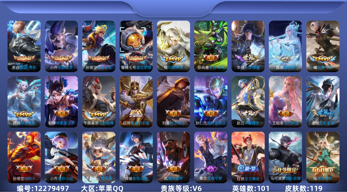 [12279497]V6 4典藏 19传说 101英雄 119皮肤 可修改实名 优质装备:天鹅之梦(小乔典藏),星空梦想(太空人),鸣剑·曳影,全息碎影(猴子典藏),黄金射手座,云鹰飞将(小将军),绛天战甲(鸡嘴战神),久胜战神,炽阳神光,一念神魔,云霓雀翎,末日机甲-孙尚香(绿蚂蚱),地狱火,仲夏夜之梦(大飞蛾),音你心动-小乔,飞鸢探春,音你心动-周瑜,乞巧织情,时之恋人-刘备(电焊工),游龙清影(小青龙),淬星耀世,超时空战士-狄仁杰,霜月吟 限定皮:白鹤梁神女,天狼溯光者,李小龙,逐梦之影,乒乒小将 史诗皮:龙之律动,百相守梦-黄忠,遇见神鹿,电玩小子(小书包),黄金分割率,特工魅影,冰冠公主,猫狗日记-孙策,节奏热浪,修罗,女仆咖啡,天才门将,心灵骇客,功夫厨神,暗隐猎兽者,幽灵船长,舞动绿茵,地狱岩魂,纤云弄巧,缤纷独角兽,乘风破浪,逐浪之夏,鹰眼统帅,未来纪元-赵云