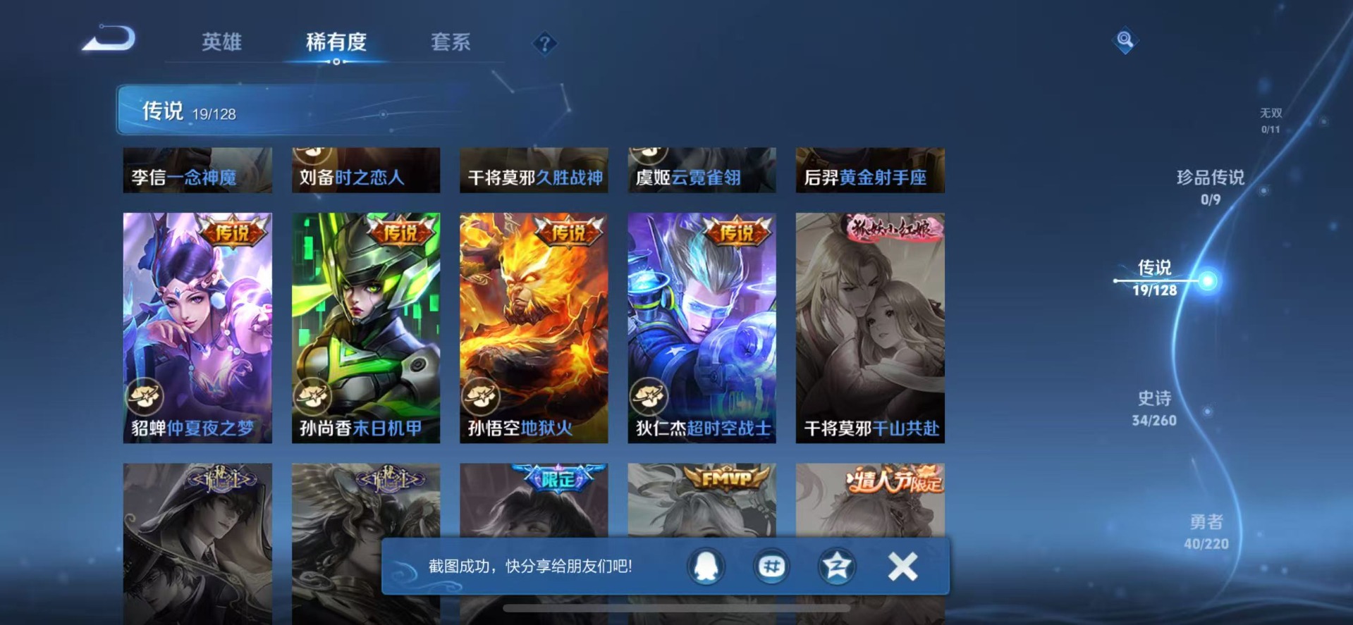 - PX_2089595-92 苹果QQ/永恒钻石/210皮肤/122英雄/2典藏/0珍品无双/0无双/1珍品传说/15传说/55史诗/7稀有英雄 【1 珍品传说】器灵·落星盏 嫦娥, 【2 典藏皮肤】无限飓风号 夏侯惇,九霄神辉 花木兰, 【15 传说皮肤】启明星使 虞姬,前尘镜 娜可露露,零号·赤焰 孙悟空,地狱火 孙悟空,凤求凰 李白,仲夏夜之梦 貂蝉,地狱之眼 宫本武藏,武陵仙君 诸葛亮,黄金