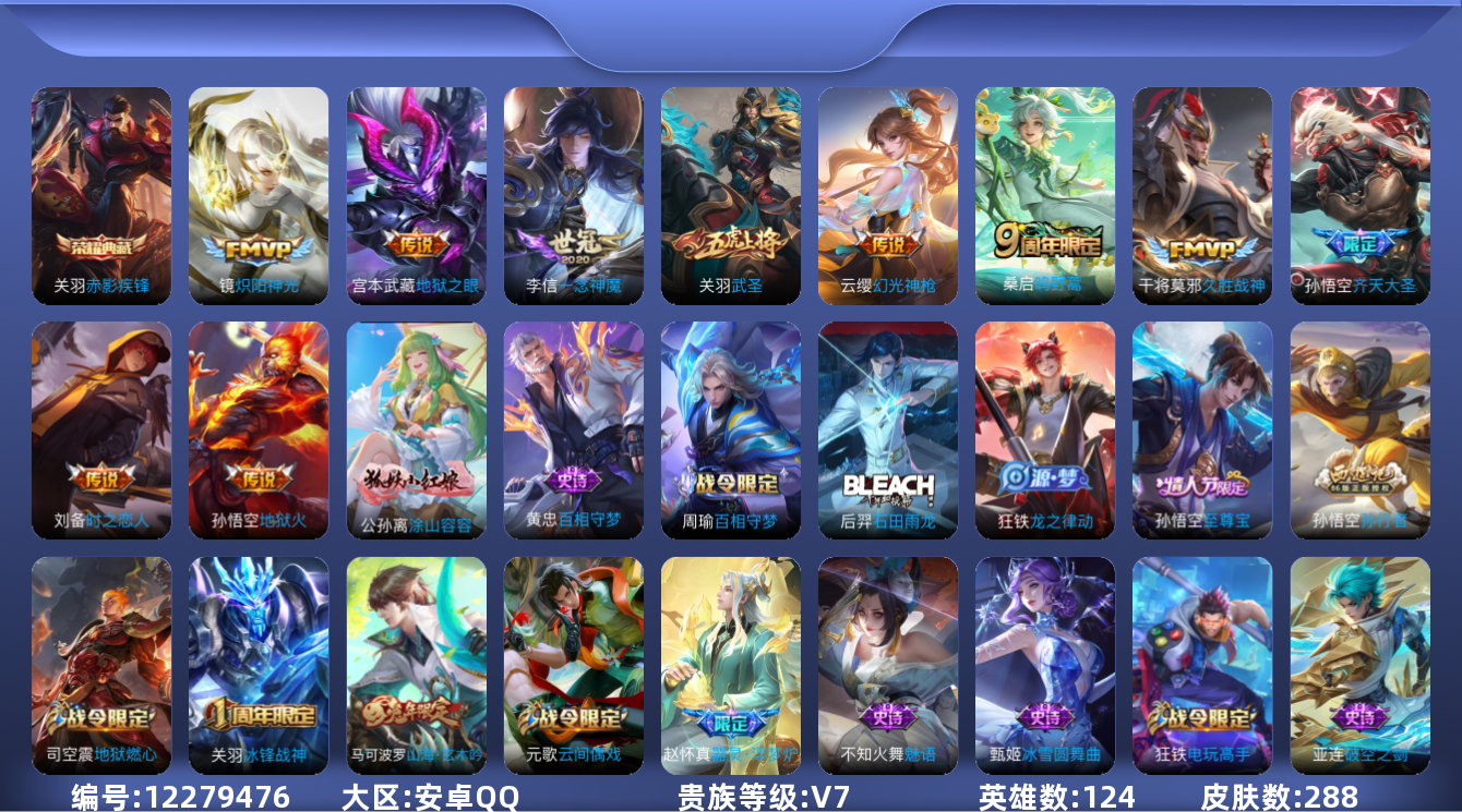 - PX_2095067-实名: 可修改 贵族等级: V7 英雄数: 124 皮肤数: 114 传说皮: 冠军飞将,黄金白羊座,猫影幻舞,超时空战士-狄仁杰,山海·苍雷引,乘龙·淬吴钩 限定皮: 御风骁将,龙胆,烈魂,孙行者,五谷丰年,神器·万象笔,山海·玄木吟