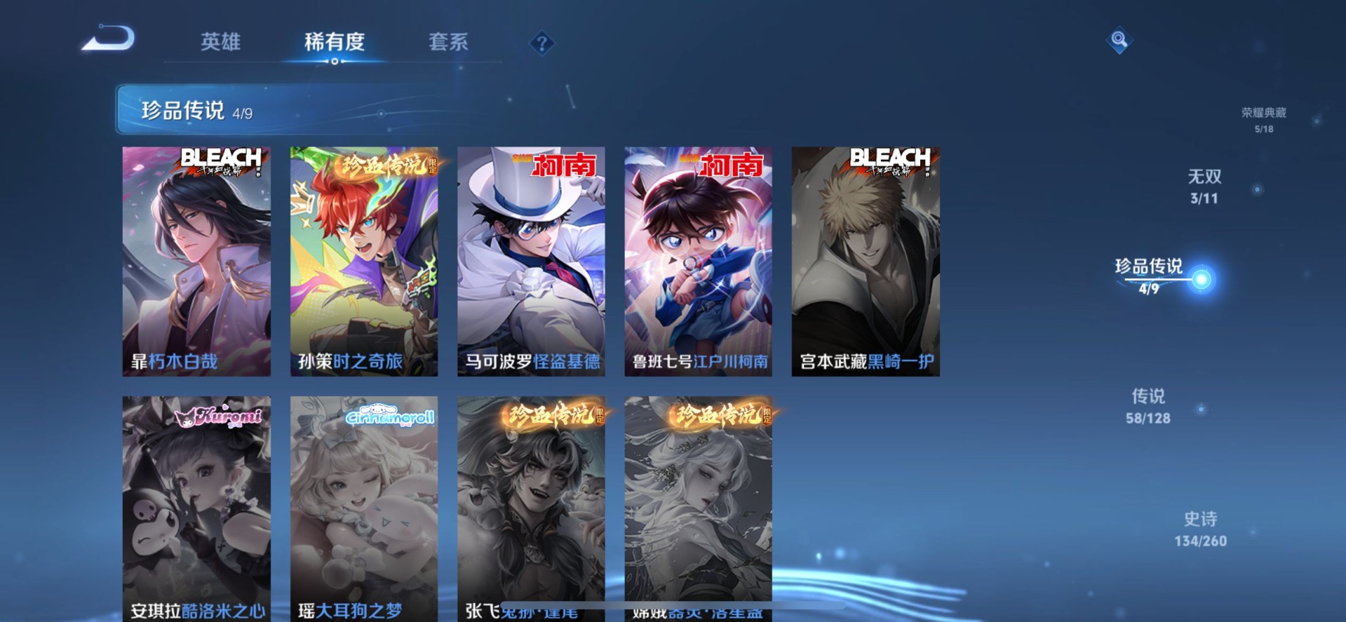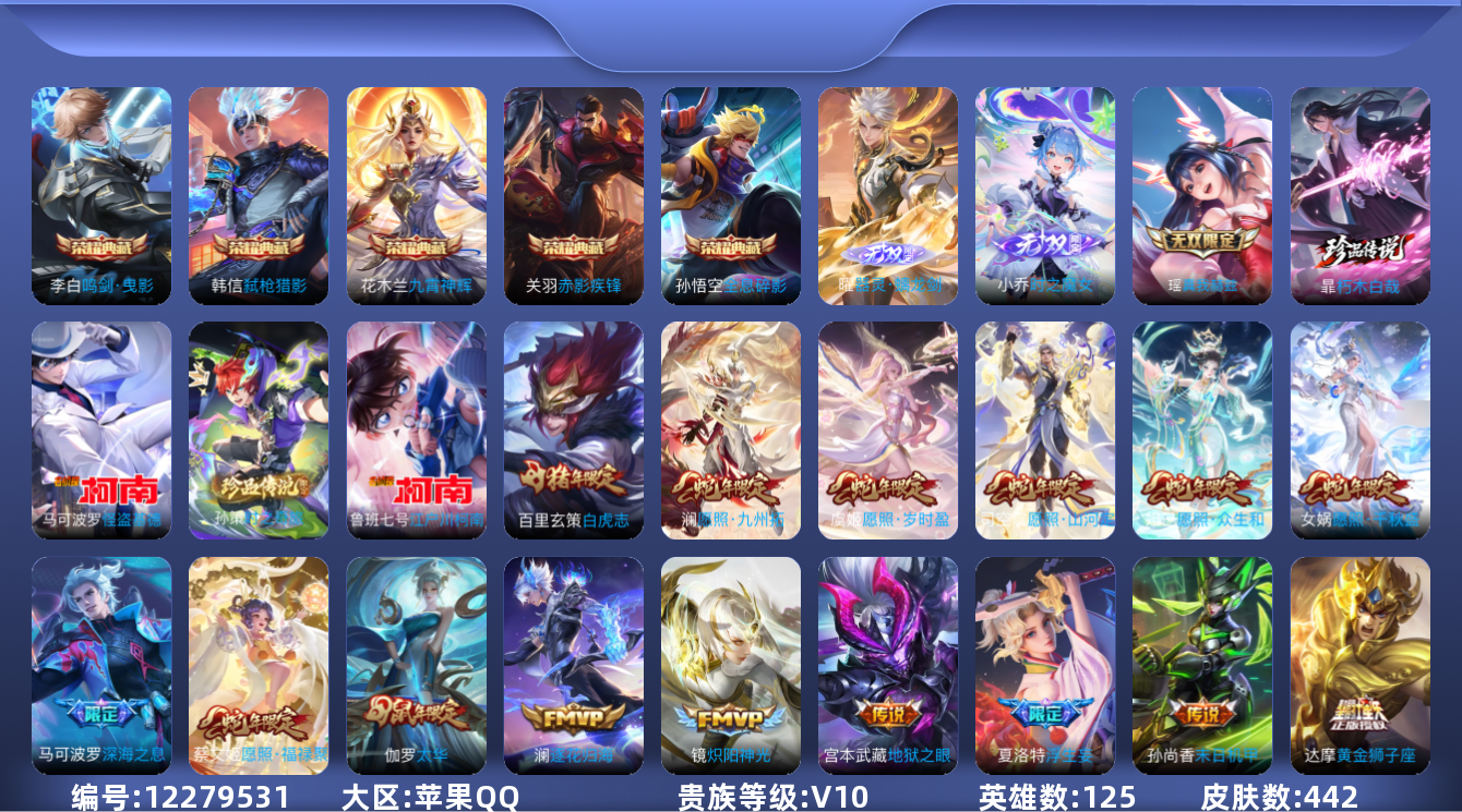 [12279531]V10 5典藏 3无双 4珍品传说 58传说 125英雄 442皮肤 可修改实名 优质装备:鸣剑·曳影,全息碎影(猴子典藏),九霄神辉(木兰典藏),赤影疾锋,弑枪猎影(韩信典藏),真我赫兹(瑶)(瑶无双),小乔时之魔女(小乔无双),器灵·螭龙剑,江户川柯南,怪盗基德,朽木白哉,黄金狮子座,黄金射手座,云鹰飞将(小将军),绛天战甲(鸡嘴战神),黄金白羊座,猫影幻舞,久胜战神,炽阳神光,一念神魔,云霓雀翎,末日机甲-孙尚香(绿蚂蚱),地狱火,仲夏夜之梦(大飞蛾),音你心动-小乔,零号·赤焰,海洋之心,地狱之眼,飞鸢探春,音你心动-周瑜,胖达荣荣,乞巧织情,时之恋人-刘备(电焊工),游龙清影(小青龙),淬星耀世,超时空战士-狄仁杰,花朝如约(花篮子),无双飞将,音你闪耀(rap皮),碎云,画中仙,浮生妄,记忆之芯(机甲兔),惊梅引,鲁班七号-时之奇旅,霜月吟,澜逐花归海,艾琳觅芳踪,玄雷天君,千劫归真,涂山容容 珍品传说:时之奇旅-孙策 传说皮:典韦战鼓燎原,星之鸣奏,幻光神枪 珍宝阁皮:妄想食味,蔷薇恋人 限定皮:愿照·九州拓(澜年限),愿照·福禄聚(蔡文姬年限),愿照·岁时盈(虞姬年限),愿照·山河定(司空震年限),愿照·众生和(妲己年限),愿照·千秋盛(女娲年限),逐霄战戟,鸣野蒿,至尊宝,白虎志(电光耗子),太华(伽罗年限),傲雪梅枪,绯月行,时之彼端,白鹤梁神女,时雨天司(水龙头),神威(电光马子),遇见飞天,高山流水,诗剑行,怒海麟威,五谷丰年,青龙志(铠年限),冰锋战神,武圣,游园惊梦,梁祝,御风骁将(吕布年限),逐梦之翼,逐梦之音,李小龙,逐梦之影,朱雀志(守约年限),如梦令-后羿,霸王别姬-项羽,霸王别姬-虞姬,默契交锋-花木兰,孙行者,大圣娶亲,青春决赛季,冰霜恋舞曲,蜜橘之夏,深海之息(深海大菠萝),山海·玄木吟(马可年限) 史诗皮:鸭鸭历险记-刘禅,飞车小橘子,器灵·浮梦炉,糖绘人间,瑰影绮梦,化蝶舞,灵蛊蚀心,星界战将,谪仙醉月,龙之律动,石田雨龙,百相守梦-周瑜,茶境仙,怒海争锋,曹操夜都魔契,百相守梦-百里守约,星界特工,百相守梦-黄忠,遇见神鹿,紫霞仙子,苍穹之光,电玩小子(小书包),白龙吟,黄金分割率,特工魅影,千年之狐,江河有灵,匿光侦查者,浮梦罗烟,魅语,无限星赏官,冰冠公主,青蛇,偶像歌手,白蛇,暗夜猫娘,龙骑士(小龙虾),末日