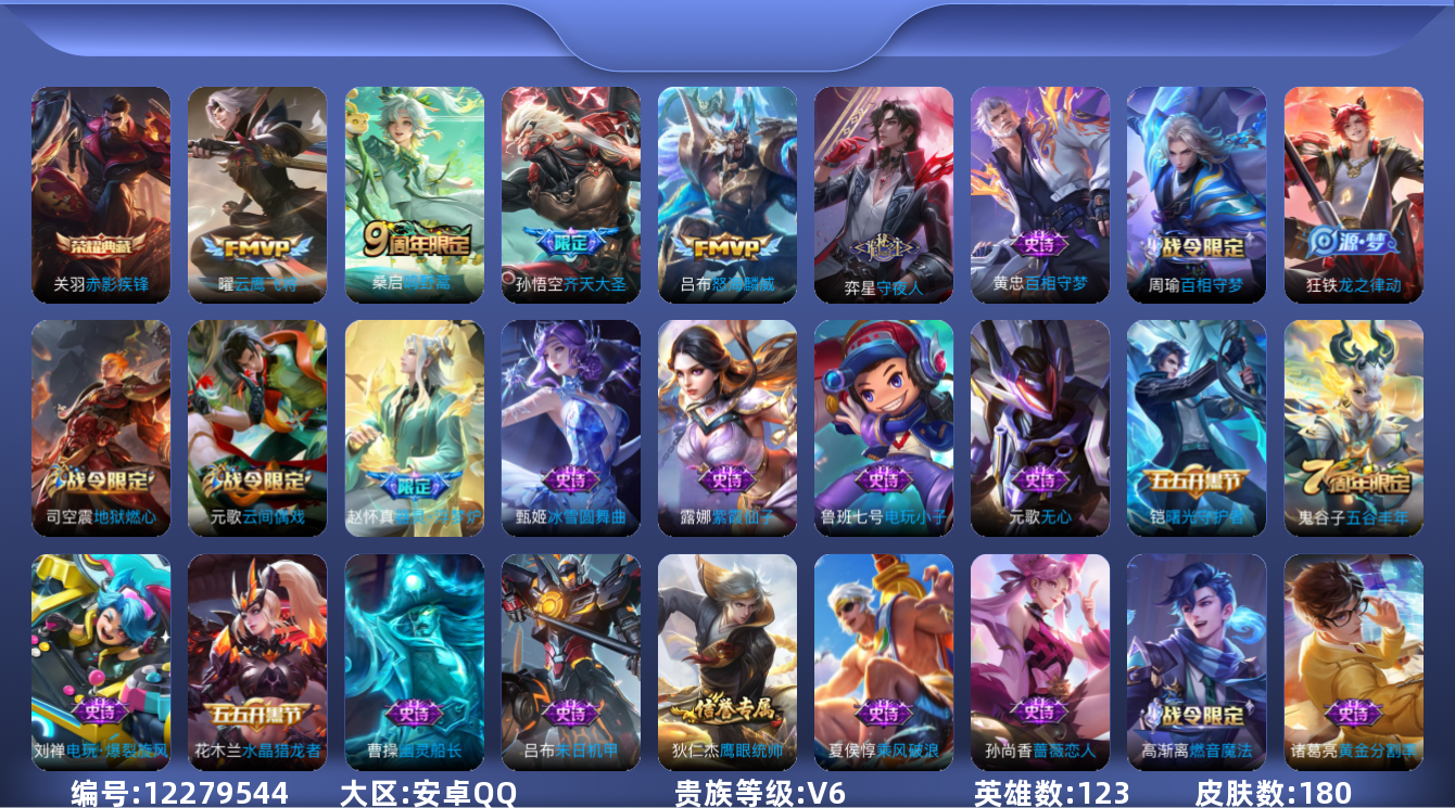 [12279544]V6 1典藏 4传说 123英雄 180皮肤 可修改实名 优质装备:赤影疾锋,云鹰飞将(小将军) 珍宝阁皮:蔷薇恋人,玩趣恶龙 限定皮:鸣野蒿,遇见飞天,高山流水,齐天大圣,怒海麟威,五谷丰年,梁祝 史诗皮:器灵·浮梦炉,星界战将,龙之律动,百相守梦-周瑜,百相守梦-黄忠,守夜人,紫霞仙子,电玩小子(小书包),黄金分割率,特工魅影,江河有灵,高渐离燃音魔法,蒙恬荣光圣徽,冰冠公主,电玩·爆裂旋风,末日机甲-吕布,猫狗日记-孙策,乱世虎臣,节奏热浪,摇滚巨星,水果甜心,绅士熊喵,暗隐猎兽者,幽灵船长,鬼剑武藏,心灵战警,舞动绿茵,地狱岩魂,乘风破浪,逐浪之夏,水晶猎龙者,曙光守护者,金属风暴,原初追逐者,圣诞狂欢,圣诞恋歌,鹰眼统帅,魅力维加斯,无心,未来纪元-赵云