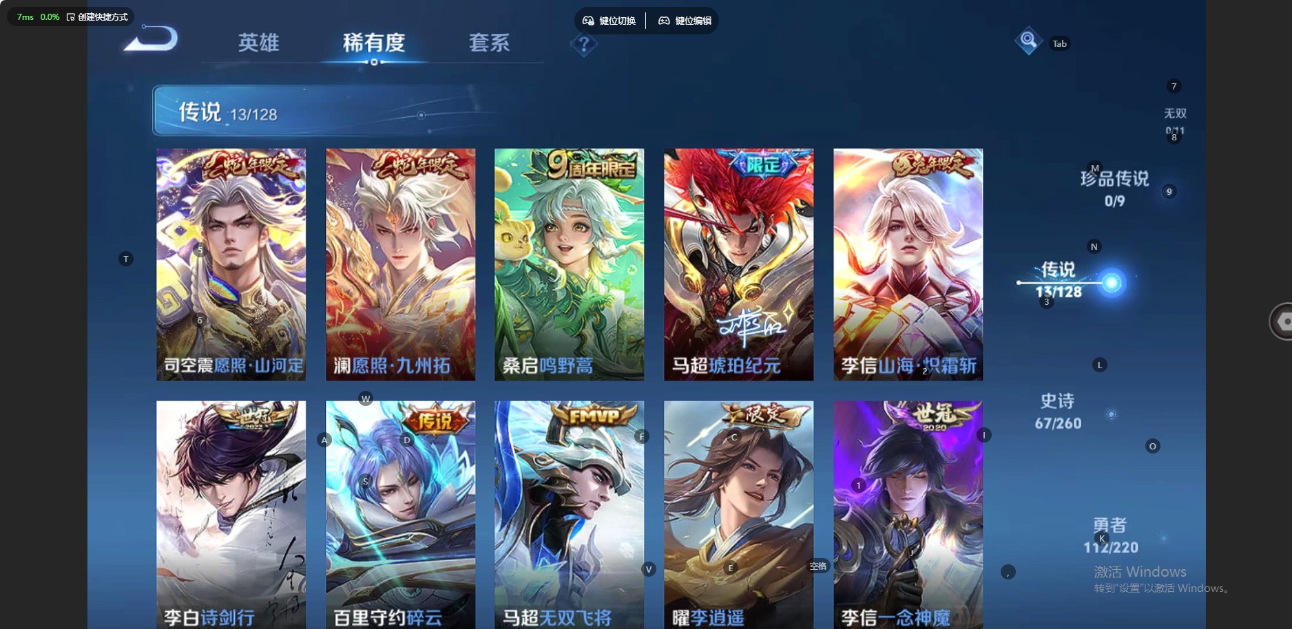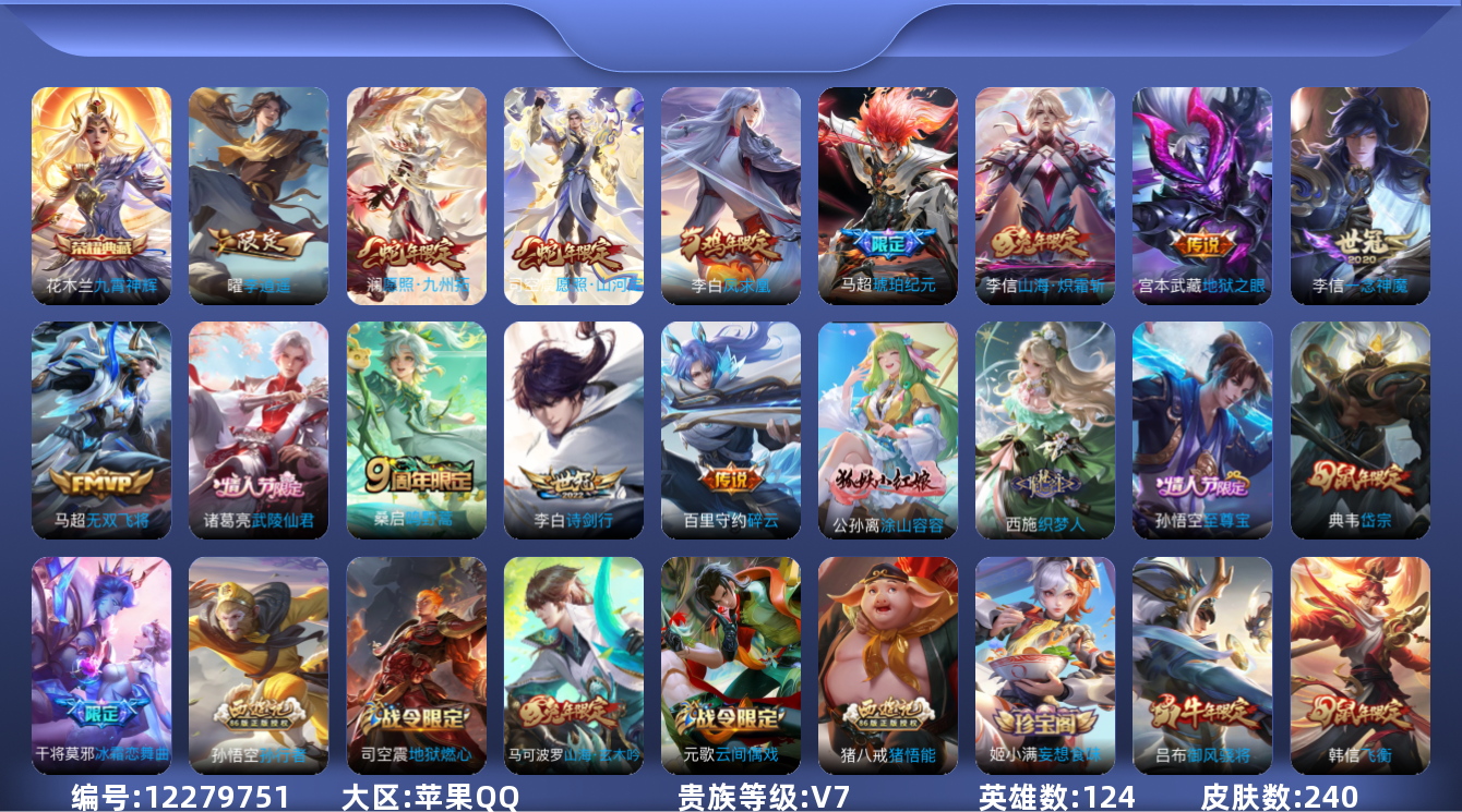 [12279751]V7 1典藏 13传说 124英雄 240皮肤 可修改实名 优质装备:九霄神辉(木兰典藏),一念神魔,地狱之眼,李逍遥,无双飞将,碎云,山海·炽霜斩(李信年限),琥珀纪元马超,涂山容容 珍宝阁皮:妄想食味,优雅恋人 限定皮:愿照·九州拓(澜年限),愿照·山河定(司空震年限),鸣野蒿,至尊宝,凤求凰(白切鸡),武陵仙君(小桃花),飞衡(韩信年限),遇见飞天,诗剑行,五谷丰年,游园惊梦,梁祝,御风骁将(吕布年限),岱宗(典韦年限),李小龙,孙行者,猪悟能,冰霜恋舞曲,百木心枪,山海·玄木吟(马可年限) 史诗皮:织梦人,紫霞仙子,特工魅影,无限星赏官,冰冠公主,偶像歌手,暗夜猫娘,百相守梦(关羽),龙骑士(小龙虾),末日机甲-吕布,猫狗日记-孙策,猫狗日记-大乔,节奏热浪,摇滚巨星,水果甜心,天才门将,星夜王子,心灵骇客,功夫厨神,德古拉伯爵,暗隐猎兽者,鬼剑武藏,心灵战警,纤云弄巧,繁星吟游(呼啦呼啦),缤纷独角兽,乘风破浪,逐浪之夏,水晶猎龙者,曙光守护者,金属风暴,原初追逐者,圣诞狂欢,鹰眼统帅,魅力维加斯,黎明之约,赏金猎手,无心,未来纪元-赵云