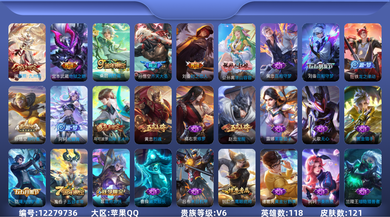 - [12088876]V10 3典藏 4无双 50传说 125英雄 402皮肤 可修改实名 优质装备:鸣剑·曳影,九霄神辉(木兰典藏),弑枪猎影(韩信典藏),碎月剑心(李白无双),韩信群星魔术团(韩信无双),离恨烟(公孙离无双),器灵·螭龙剑,黄金狮子座,黄金射手座,冠军飞将,云鹰飞将(小将军),炽阳神光,一念神魔,云霓雀翎,末日机甲-孙尚香(绿蚂蚱),仲夏夜之梦(大飞蛾),地狱之眼,音你心动-周瑜,时之恋人-刘备(电焊工),游龙清影(小青龙),末日机甲-孙策,挚爱之约,无双飞将,山海·炽霜斩(李信年限),山海·琳琅生(小乔年限),山海·苍雷引(电光曜子),炽翼辉光(娃娃菜牛角包),画中仙,记忆之芯(机甲兔),鹤羽星尊,霜月吟,澜逐花归海,艾琳觅芳踪,琥珀纪元马超 传说皮:乘龙·问璇玑(孙尚香年限),乘龙·铭钟鼎(赵云年限),乘龙·淬吴钩(孙策年限),吕布曦玄引,落雪白狼,九山相柳,幻光神枪 珍宝阁皮:妄想食味,万物之道,蔷薇恋人,玩趣恶龙 限定皮:愿照·九州拓(澜年限),愿照·福禄聚(蔡文姬年限),愿照·岁时盈(虞姬年限),愿照·山河定(司空震年限),愿照·众生和(妲己年限),愿照·千秋盛(女娲年限),鸣野蒿,夏侯惇霜北刀,至尊宝,白虎志(电光耗子),武陵仙君(小桃花),神威(电光马子),飞衡(韩信年限),山海·碧波行(瑶年限),高山流水,诗剑行,五谷丰年,武圣,游园惊梦,梁祝,岱宗(典韦年限),李小龙,如梦令-后羿,圣诞老人,天魔缭乱,美猴王,匿光追影者,寅虎·赤拳(老虎年限),玉兔公主,启示之音,神器·万象笔,山海·玄木吟(马可年限),冰霜神祇 史诗皮:鸭鸭历险记-刘禅,糖绘人间,狼魂孤将,化蝶舞,灵蛊蚀心,龙之律动,石田雨龙,百相守梦-周瑜,茶境仙,幻珠鲛人,炽弈燎原,撼地雄心,破空之剑,涂山红红,东方月初,蒙犽顽岩魄,埋骨钱,海诺心动手记,琥珀纪元伽罗,蔬乡物语(鲁班七号),曹操夜都魔契,乘龙·聚宝船(安琪拉年限),乘龙·忆丹青(大乔年限),百相守梦-百里守约,百相守梦-黄忠,守夜人,紫霞仙子,苍穹之光,特工魅影,千年之狐,永昼,江河有灵,鹤归松栖(赵怀真),魅语,百解令(蒙犽),高渐离燃音魔法,蒙恬荣光圣徽,无限星赏官,冰冠公主,偶像歌手,晚萤,电玩·爆裂旋风,百相守梦(刘备),暗夜猫娘,龙骑士(小龙虾),末日机甲-吕布,猫狗日记-孙策,乱世虎臣,节奏热浪,修罗,女仆咖啡