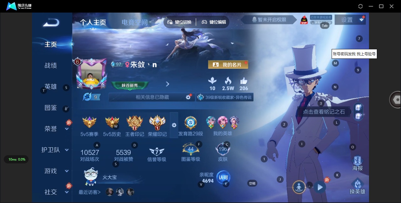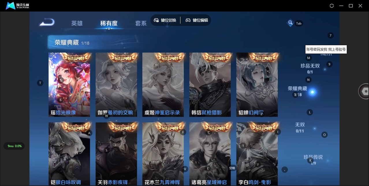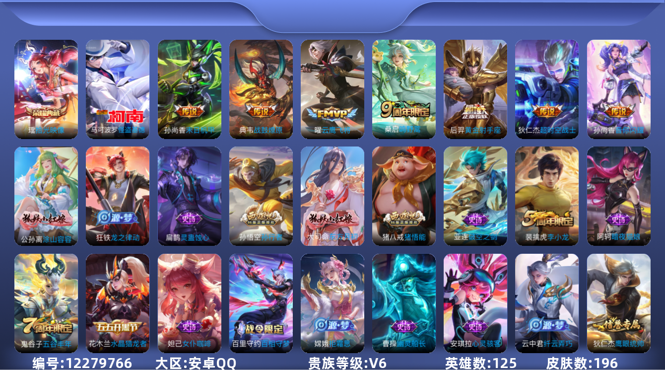 - [12058510]V9 3典藏 28传说 125英雄 273皮肤 典藏英雄武则天 可修改实名 优质装备:倪克斯神谕(宇宙婆娘),无限飓风号(高达),鸣剑·曳影,黄金狮子座,黄金射手座,云鹰飞将(小将军),绛天战甲(鸡嘴战神),猫影幻舞,久胜战神,炽阳神光,一念神魔,末日机甲-孙尚香(绿蚂蚱),仲夏夜之梦(大飞蛾),零号·赤焰,地狱之眼,乞巧织情,淬星耀世,超时空战士-狄仁杰,末日机甲-孙策,无双飞将,霜月吟 传说皮:幻光神枪 珍宝阁皮:优雅恋人,蔷薇恋人,女武神 限定皮:愿照·山河定(司空震年限),鸣野蒿,至尊宝,白虎志(电光耗子),凤求凰(白切鸡),凤凰于飞,武陵仙君(小桃花),神威(电光马子),飞衡(韩信年限),高山流水,齐天大圣,五谷丰年,青龙志(铠年限),冰锋战神,武圣,游园惊梦,梁祝,御风骁将(吕布年限),岱宗(典韦年限),天狼溯光者,天狼绘梦者,李小龙,逐梦之影,朱雀志(守约年限),如梦令-后羿,默契交锋-花木兰,一生所爱,天魔缭乱,山海·玄木吟(马可年限) 史诗皮:星界战将,百相守梦-百里守约,百相守梦-黄忠,紫霞仙子,苍穹之光,电玩小子(小书包),白龙吟,黄金分割率,特工魅影,千年之狐,江河有灵,魅语,高渐离燃音魔法,蒙恬荣光圣徽,无限星赏官,冰冠公主,偶像歌手,电玩·爆裂旋风,龙骑士(小龙虾),末日机甲-吕布,猫狗日记-孙策,猫狗日记-大乔,乱世虎臣,节奏热浪,修罗,女仆咖啡,水果甜心,天才门将,星夜王子,心灵骇客,功夫厨神,德古拉伯爵,暗隐猎兽者,幽灵船长,鬼剑武藏,心灵战警,舞动绿茵,地狱岩魂,拒霜思,缤纷独角兽,乘风破浪,逐浪之夏,水晶猎龙者,曙光守护者,热力回旋,箭羽风息,金属风暴,原初追逐者,圣诞狂欢,圣诞恋歌,鹰眼统帅,魅力维加斯,黎明之约,赏金猎手,无心,未来纪元-赵云