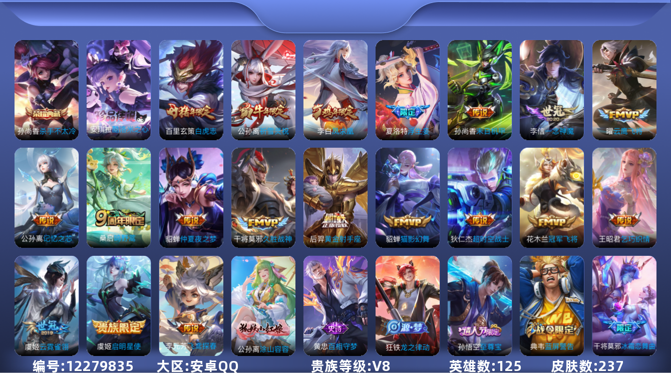 - [11713260]V8 2典藏 1珍品传说 14传说 124英雄 263皮肤 可修改实名 优质装备:全息碎影(猴子典藏),九霄神辉(木兰典藏),怪盗基德,久胜战神,末日机甲-孙尚香(绿蚂蚱),地狱火,超时空战士-狄仁杰,山海·炽霜斩(李信年限),涂山容容 传说皮:九山相柳 珍宝阁皮:优雅恋人,蔷薇恋人,玩趣恶龙 限定皮:至尊宝,白虎志(电光耗子),凤求凰(白切鸡),太华(伽罗年限),神威(电光马子),飞衡(韩信年限),瑞麟志(木兰年限),遇见飞天,高山流水,诗剑行,齐天大圣,五谷丰年,青龙志(铠年限),冰锋战神,梁祝,逐梦之翼,岱宗(典韦年限),李小龙,逐梦之影,逐梦之光,玄武志(苏烈年限),朱雀志(守约年限),永曜之星,辉光之辰,如梦令-后羿,霸王别姬-项羽,霸王别姬-虞姬,猪悟能,大圣娶亲,天魔缭乱,蜜橘之夏,美猴王 史诗皮:百相守梦-黄忠,紫霞仙子,苍穹之光,电玩小子(小书包),黄金分割率,特工魅影,千年之狐,冰冠公主,偶像歌手,晚萤,暗夜猫娘,龙骑士(小龙虾),末日机甲-吕布,猫狗日记-孙策,猫狗日记-大乔,乱世虎臣,节奏热浪,修罗,女仆咖啡,水果甜心,天才门将,星夜王子,功夫厨神,德古拉伯爵,暗隐猎兽者,幽灵船长,鬼剑武藏,舞动绿茵,地狱岩魂,纤云弄巧,繁星吟游(呼啦呼啦),缤纷独角兽,乘风破浪,逐浪之夏,水晶猎龙者,曙光守护者,金属风暴,原初追逐者,圣诞狂欢,圣诞恋歌,鹰眼统帅,暗夜贵公子,魅力维加斯,黎明之约,无心,未来纪元-赵云