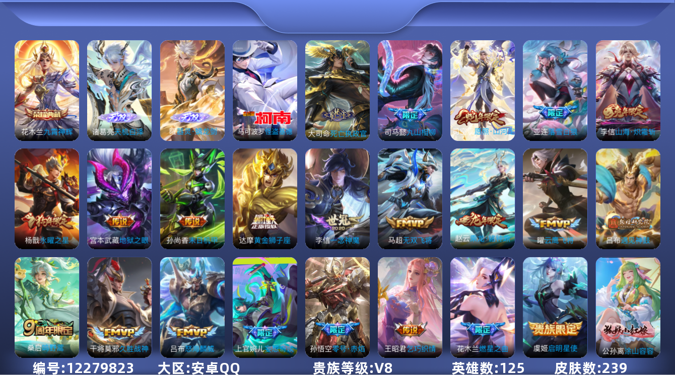 [12279823]V8 1典藏 2无双 1珍品传说 22传说 125英雄 239皮肤 可修改实名 优质装备:九霄神辉(木兰典藏),器灵·螭龙剑,天机白泽,怪盗基德,黄金狮子座,云鹰飞将(小将军),久胜战神,一念神魔,末日机甲-孙尚香(绿蚂蚱),零号·赤焰,地狱之眼,乞巧织情,无双飞将,山海·炽霜斩(李信年限),燃星之曲,妄想奇谈,遇见神鼓,涂山容容 传说皮:乘龙·铭钟鼎(赵云年限),落雪白狼,死亡执政官,九山相柳 珍宝阁皮:胡桃夹子 限定皮:愿照·山河定(司空震年限),逐霄战戟,鸣野蒿,至尊宝,傲雪梅枪,怒海麟威,降魔,梁祝,岱宗(典韦年限),永曜之星,神器·万象笔 史诗皮:鸭鸭历险记-刘禅,化蝶舞,星界战将,谪仙醉月,龙之律动,雪豹·霜爪,藏狐·褐绒,石田雨龙,百相守梦-周瑜,茶境仙,怒海争锋,破空之剑,琥珀纪元伽罗,蔬乡物语(鲁班七号),百相守梦-百里守约,星界特工,百相守梦-黄忠,织梦人,守夜人,白龙吟,黄金分割率,特工魅影,千年之狐,永昼,江河有灵,真我赫兹(百里守约),魅语,百解令(蒙犽),高渐离燃音魔法,蒙恬荣光圣徽,偶像歌手,电玩·爆裂旋风,百相守梦(关羽),末日机甲-吕布,猫狗日记-孙策,乱世虎臣,节奏热浪,修罗,女仆咖啡,摇滚巨星,水果甜心,天才门将,功夫厨神,暗隐猎兽者,幽灵船长,鬼剑武藏,暗渊魔法,心灵战警,天秀·启明,地狱岩魂,纤云弄巧,拒霜思,缤纷独角兽,逐浪之夏,月团寄思,水晶猎龙者,曙光守护者,唤灵魅影,金属风暴,圣诞狂欢,圣诞恋歌,鹰眼统帅,暗夜贵公子,魅力维加斯,黎明之约,雪上飞焰,未来纪元-赵云