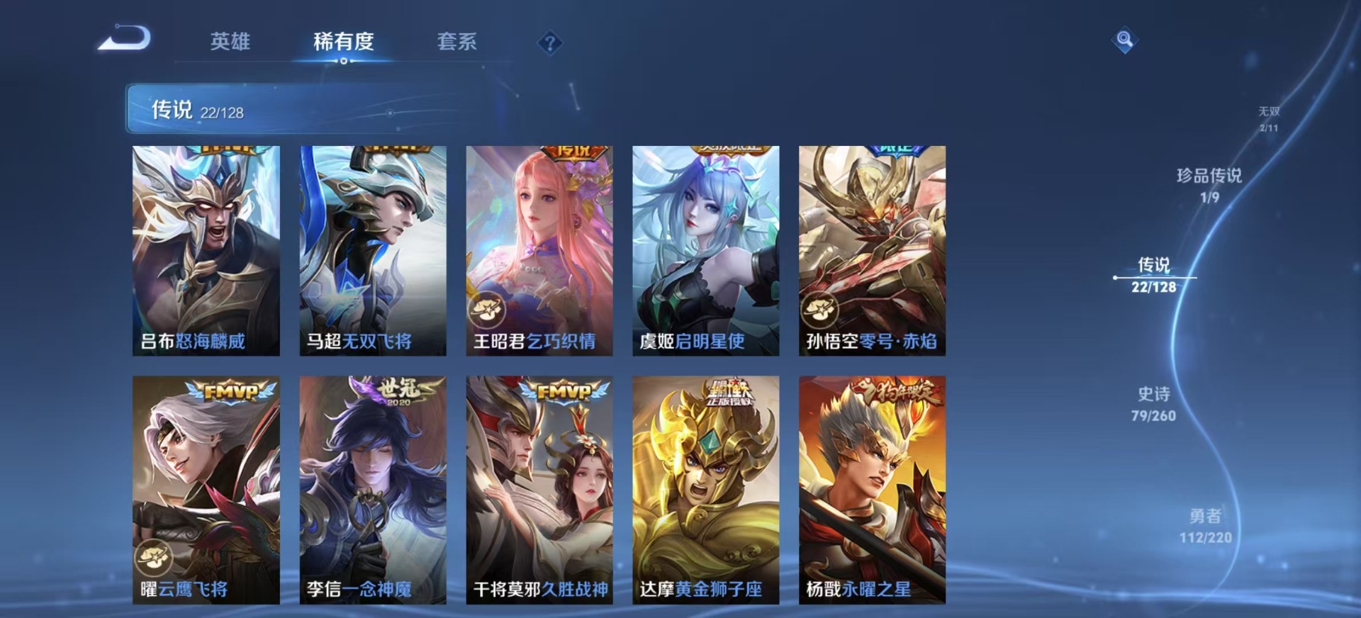 - [11524280]V8 2典藏 11传说 122英雄 207皮肤 可修改实名 优质装备:鸣剑·曳影,全息碎影(猴子典藏),黄金射手座,久胜战神,一念神魔,末日机甲-孙尚香(绿蚂蚱),地狱火,时之恋人-刘备(电焊工),淬星耀世 珍宝阁皮:玩趣恶龙 限定皮:至尊宝,凤求凰(白切鸡),遇见飞天,高山流水,诗剑行,怒海麟威,五谷丰年,青龙志(铠年限),梁祝,李小龙,逐梦之影,猪悟能,大圣娶亲 史诗皮:谪仙醉月,紫霞仙子,电玩小子(小书包),白龙吟,特工魅影,千年之狐,无限星赏官,冰冠公主,偶像歌手,暗夜猫娘,龙骑士(小龙虾),乱世虎臣,修罗,女仆咖啡,水果甜心,天才门将,星夜王子,心灵骇客,功夫厨神,德古拉伯爵,暗隐猎兽者,幽灵船长,鬼剑武藏,地狱岩魂,乘风破浪,水晶猎龙者,圣诞狂欢,圣诞恋歌,鹰眼统帅,魅力维加斯,黎明之约,无心