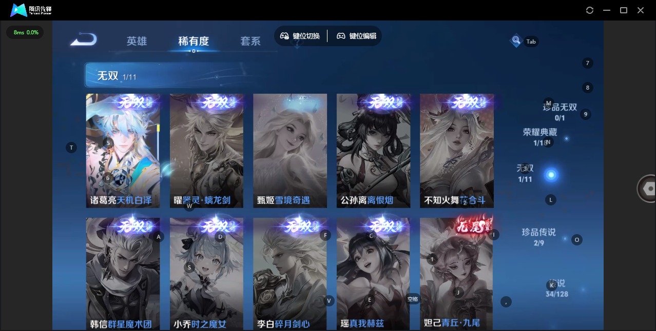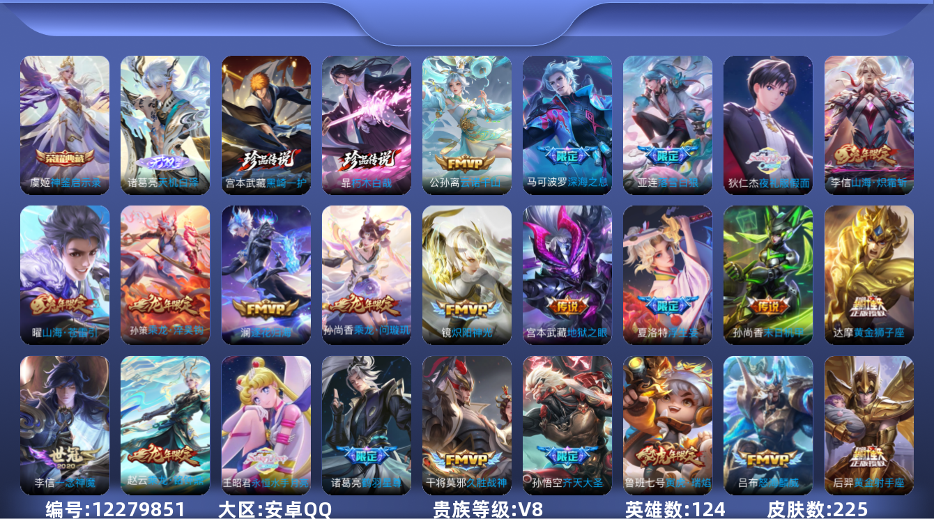 [12279851]V8 1典藏 1无双 2珍品传说 34传说 124英雄 225皮肤 可修改实名 优质装备:神鉴启示录,天机白泽,朽木白哉,黑崎一护,黄金狮子座,黄金射手座,久胜战神,炽阳神光,一念神魔,末日机甲-孙尚香(绿蚂蚱),地狱之眼,飞鸢探春,音你心动-周瑜,时之恋人-刘备(电焊工),淬星耀世,花朝如约(花篮子),碎云,山海·炽霜斩(李信年限),山海·苍雷引(电光曜子),燃星之曲,浮生妄,鹤羽星尊,妄想实况,鲁班七号-时之奇旅,永恒水手月亮,夜礼服假面,澜逐花归海,涂山容容 传说皮:乘龙·问璇玑(孙尚香年限),乘龙·铭钟鼎(赵云年限),乘龙·淬吴钩(孙策年限),落雪白狼,云诺千山 珍宝阁皮:妄想食味 限定皮:至美·化雀舞,齐天大圣,怒海麟威,游园惊梦,寅虎·瑞焰(虎皮蛋子),深海之息(深海大菠萝),神器·万象笔,山海·玄木吟(马可年限) 史诗皮:鸭鸭历险记-刘禅,狼魂孤将,星界战将,龙之律动,石田雨龙,百相守梦-周瑜,怒海争锋,炽弈燎原,破空之剑,东方月初,海诺心动手记,琥珀纪元伽罗,蔬乡物语(鲁班七号),超元猎域,星界特工,百相守梦-黄忠,织梦人,紫霞仙子,黄金分割率,特工魅影,江河有灵,匿光侦查者,鹤归松栖(赵怀真),魅语,百解令(蒙犽),高渐离燃音魔法,蒙恬荣光圣徽,冰冠公主,偶像歌手,电玩·爆裂旋风,猫狗日记-孙策,猫狗日记-大乔,女仆咖啡,摇滚巨星,水果甜心,绅士熊喵,星夜王子,时之奇旅-安琪拉,功夫厨神,暗隐猎兽者,纤云弄巧,拒霜思,缤纷独角兽,乘风破浪,箭羽风息,唤灵魅影,金属风暴,原初追逐者,鹰眼统帅,赏金猎手,奇遇舞章,滕王阁序