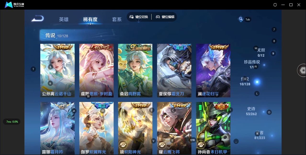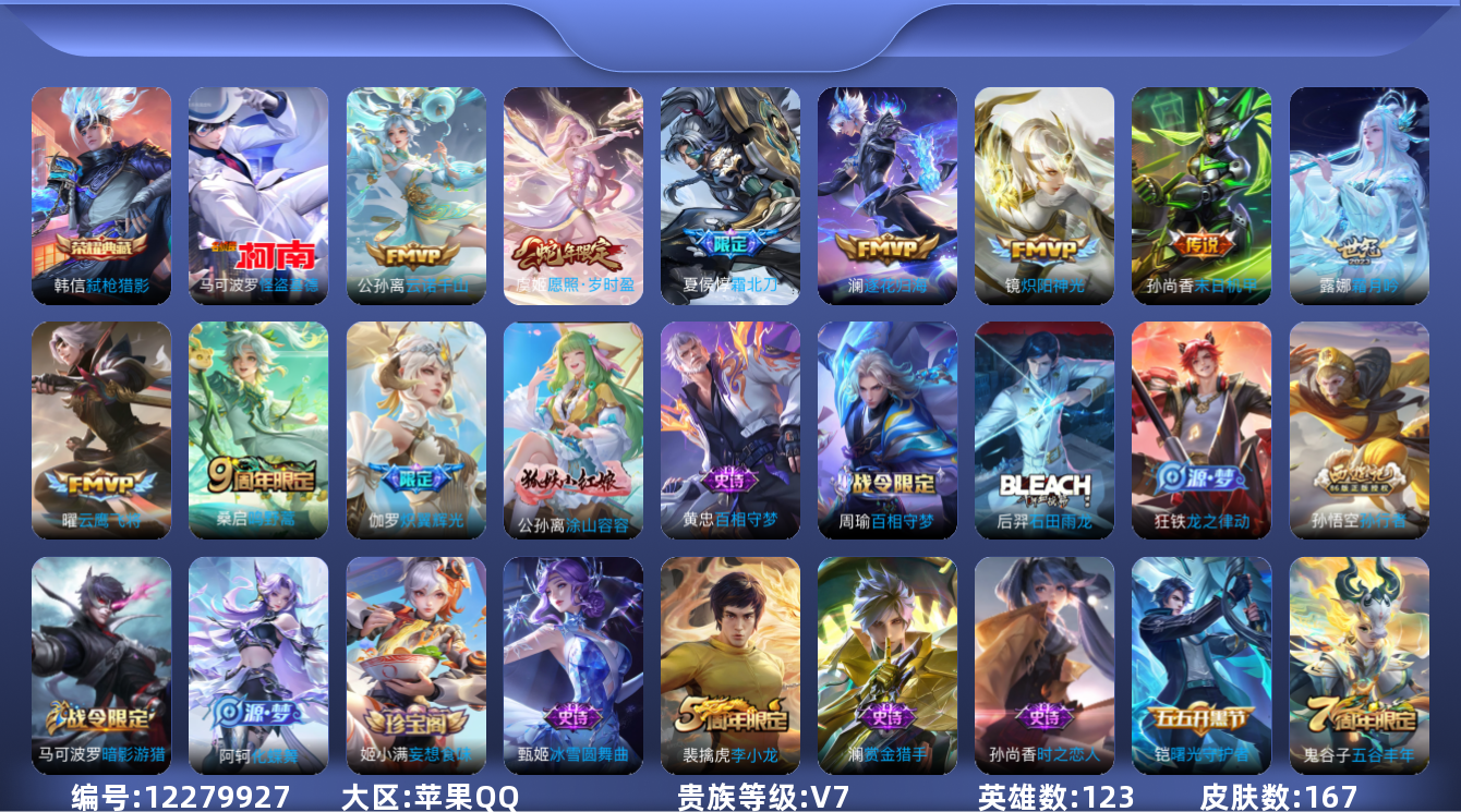 [12279927]V7 1典藏 1珍品传说 10传说 123英雄 167皮肤 可修改实名 优质装备:弑枪猎影(韩信典藏),怪盗基德,云鹰飞将(小将军),炽阳神光,末日机甲-孙尚香(绿蚂蚱),炽翼辉光(娃娃菜牛角包),霜月吟,澜逐花归海,涂山容容 传说皮:云诺千山 珍宝阁皮:妄想食味,玩趣恶龙 限定皮:愿照·岁时盈(虞姬年限),逐霄战戟,鸣野蒿,夏侯惇霜北刀,五谷丰年,李小龙,孙行者 史诗皮:化蝶舞,龙之律动,石田雨龙,百相守梦-周瑜,茶境仙,百相守梦-黄忠,怒海争锋,蔬乡物语(鲁班七号),百相守梦-百里守约,黄金分割率,特工魅影,江河有灵,电玩·爆裂旋风,龙骑士(小龙虾),猫狗日记-孙策,猫狗日记-大乔,时之恋人-孙尚香,乱世虎臣,节奏热浪,女仆咖啡,水果甜心,星夜王子,心灵骇客,功夫厨神,暗隐猎兽者,幽灵船长,鬼剑武藏,心灵战警,舞动绿茵,缤纷独角兽,乘风破浪,逐浪之夏,水晶猎龙者,曙光守护者,热力回旋,金属风暴,圣诞狂欢,圣诞恋歌,鹰眼统帅,暗夜贵公子,魅力维加斯,赏金猎手,未来纪元-赵云