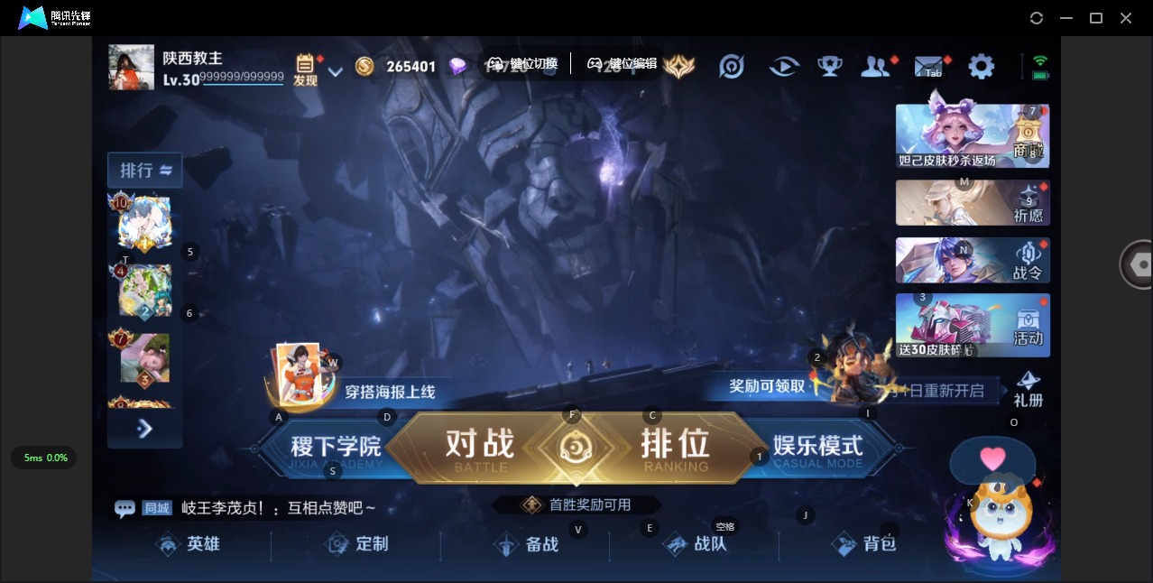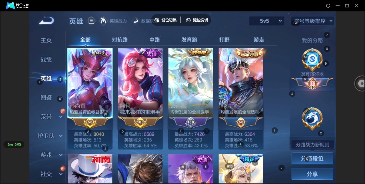 - PX_2082801-贵族等级: V3 英雄数: 68 皮肤数: 39 传说皮: 胖达荣荣 限定皮: 山海·玄木吟,鸣野蒿,愿照·众生和