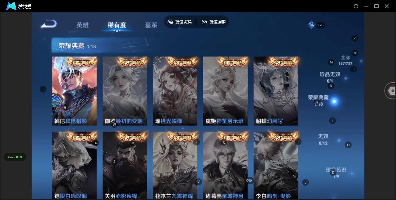 - [11523648]V8 2典藏 13传说 125英雄 273皮肤 可修改实名 优质装备:鸣剑·曳影,九霄神辉(木兰典藏),绛天战甲(鸡嘴战神),炽阳神光,末日机甲-孙尚香(绿蚂蚱),地狱火,仲夏夜之梦(大飞蛾),超时空战士-狄仁杰,澜逐花归海 传说皮:云诺千山 珍宝阁皮:优雅恋人,蔷薇恋人,女武神 限定皮:至尊宝,武陵仙君(小桃花),时雨天司(水龙头),飞衡(韩信年限),遇见飞天,高山流水,游园惊梦,梁祝,李小龙,朱雀志(守约年限),永曜之星,辉光之辰,如梦令-后羿,霸王别姬-虞姬,孙行者,猪悟能,青春决赛季,寅虎·瑞焰(虎皮蛋子) 史诗皮:灵蛊蚀心,龙之律动,石田雨龙,百相守梦-周瑜,琥珀纪元伽罗,百相守梦-黄忠,紫霞仙子,苍穹之光,白龙吟,黄金分割率,千年之狐,江河有灵,百解令(蒙犽),高渐离燃音魔法,魅语,冰冠公主,猫狗日记-孙策,乱世虎臣,节奏热浪,女仆咖啡,水果甜心,天才门将,时之奇旅-安琪拉,德古拉伯爵,暗隐猎兽者,幽灵船长,鬼剑武藏,心灵战警,舞动绿茵,地狱岩魂,纤云弄巧,拒霜思,逐浪之夏,水晶猎龙者,金属风暴,原初追逐者,圣诞狂欢,圣诞恋歌,鹰眼统帅,王者之锤,暗夜贵公子,魅力维加斯,黎明之约,奇遇舞章,未来纪元-赵云