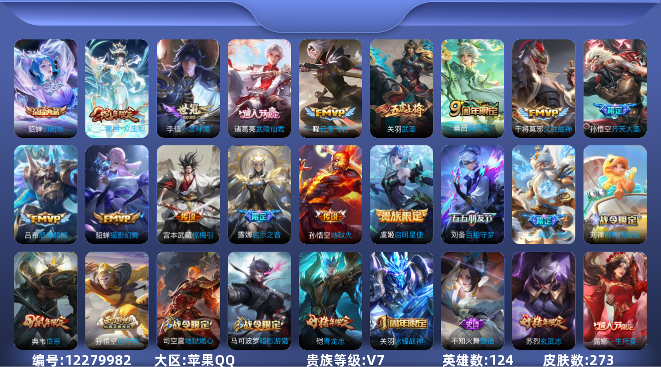 [12279982]【商品标题】:苹果Q-V7-永恒钻石IV段位-124英雄-273皮肤-1典藏-0珍品无双-0无双-0珍品传说-14传说-64史诗