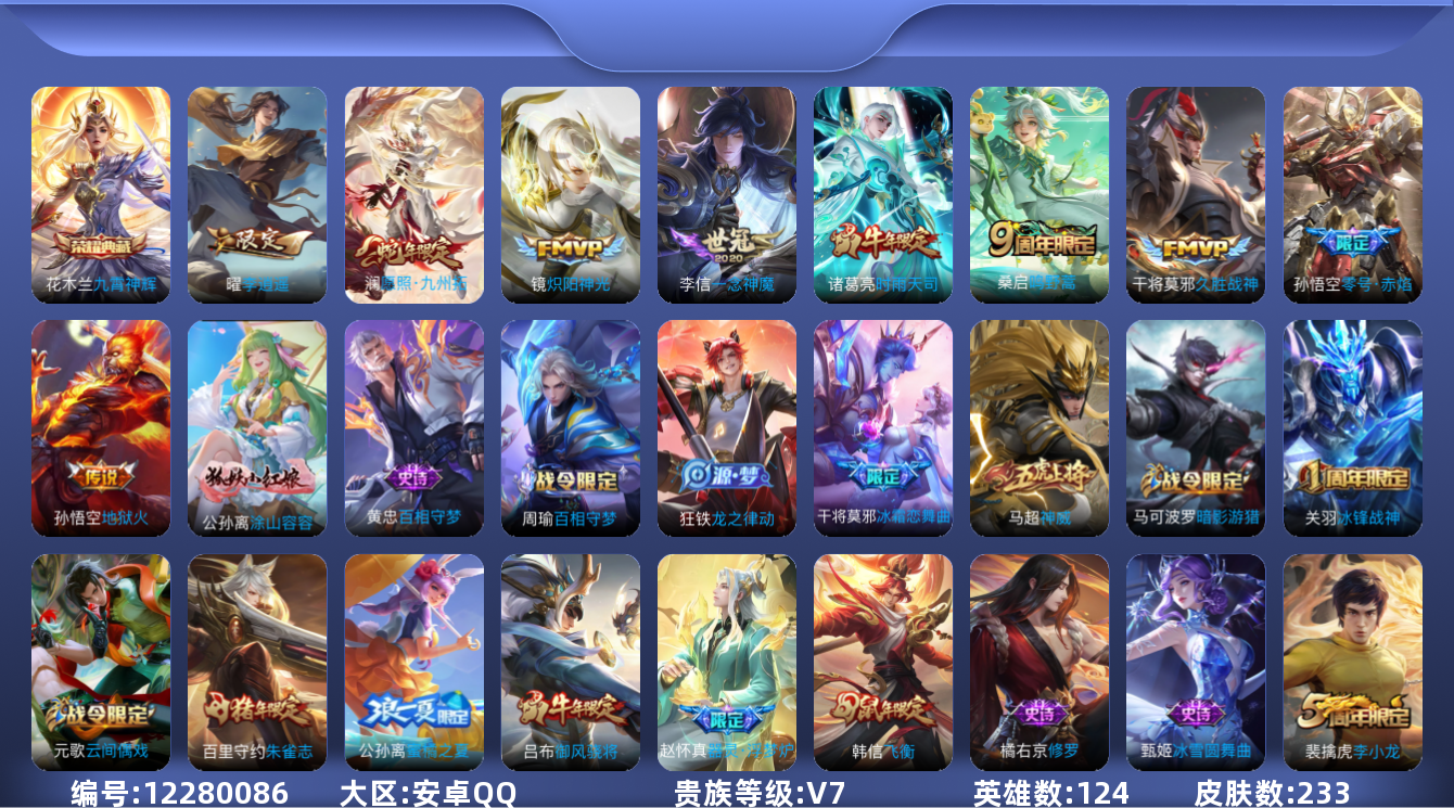 [12280086]V7 1典藏 9传说 124英雄 233皮肤 可修改实名 优质装备:九霄神辉(木兰典藏),久胜战神,炽阳神光,一念神魔,地狱火,零号·赤焰,李逍遥,涂山容容 珍宝阁皮:女武神,玩趣恶龙 限定皮:愿照·九州拓(澜年限),鸣野蒿,时雨天司(水龙头),神威(电光马子),飞衡(韩信年限),高山流水,冰锋战神,天狼运算者,梁祝,御风骁将(吕布年限),李小龙,朱雀志(守约年限),如梦令-后羿,冰霜恋舞曲,蜜橘之夏 史诗皮:器灵·浮梦炉,龙之律动,百相守梦-周瑜,百相守梦-黄忠,苍穹之光,白龙吟,黄金分割率,特工魅影,千年之狐,百解令(蒙犽),偶像歌手,乱世虎臣,节奏热浪,修罗,女仆咖啡,水果甜心,星夜王子,心灵骇客,功夫厨神,德古拉伯爵,幽灵船长,鬼剑武藏,舞动绿茵,地狱岩魂,纤云弄巧,拒霜思,缤纷独角兽,乘风破浪,逐浪之夏,水晶猎龙者,曙光守护者,箭羽风息,金属风暴,原初追逐者,圣诞狂欢,鹰眼统帅,黎明之约,未来纪元-赵云