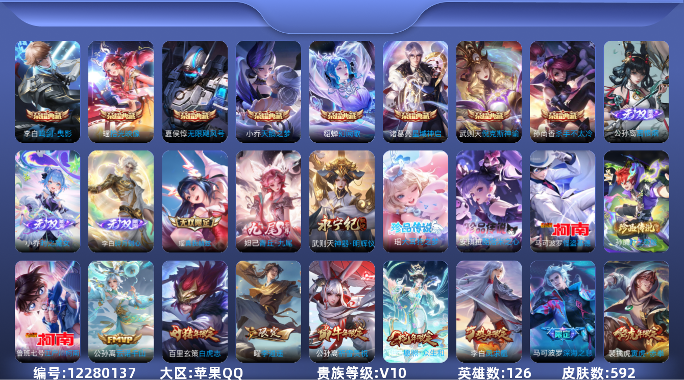 [12280137]V10 8典藏 6无双 5珍品传说 74传说 126英雄 592皮肤 典藏英雄武则天 女号 可修改实名 优质装备:天鹅之梦(小乔典藏),倪克斯神谕(宇宙婆娘),无限飓风号(高达),杀手不太冷,鸣剑·曳影,星域神启(倪克斯贼亮),幻阙歌(貂蝉典藏),真我赫兹(瑶)(瑶无双),神器·明辉仪,青丘·九尾(妲己无双),碎月剑心(李白无双),小乔时之魔女(小乔无双),离恨烟(公孙离无双),拾光映像(瑶典藏),江户川柯南,怪盗基德,酷洛米之心,大耳狗之梦,黄金狮子座,黄金射手座,冠军飞将,云鹰飞将(小将军),绛天战甲(鸡嘴战神),黄金白羊座,猫影幻舞,久胜战神,炽阳神光,一念神魔,云霓雀翎,末日机甲-孙尚香(绿蚂蚱),地狱火,仲夏夜之梦(大飞蛾),音你心动-小乔,零号·赤焰,海洋之心,地狱之眼,飞鸢探春,音你心动-周瑜,胖达荣荣,李逍遥,乞巧织情,时之恋人-刘备(电焊工),游龙清影(小青龙),淬星耀世,超时空战士-狄仁杰,遇见胡旋,花朝如约(花篮子),挚爱之约,挚爱花嫁,无双飞将,神器·明辉仪,山海·炽霜斩(李信年限),山海·琳琅生(小乔年限),山海·苍雷引(电光曜子),燃星之曲,画中仙,青丘·九尾,妄想实况,大乔-时之奇旅,澜逐花归海,艾琳觅芳踪,黄金天蝎座,朵莉亚心动手记,牧神诗旅,玄雷天君,涂山容容 珍品传说:时之奇旅-孙策 传说皮:乘龙·铭钟鼎(赵云年限),乘龙·淬吴钩(孙策年限),云诺千山,铠冥王哈迪斯,幻光神枪 珍宝阁皮:妄想食味,万物之道,优雅恋人,蔷薇恋人,女武神,玩趣恶龙 限定皮:愿照·众生和(妲己年限),逐霄战戟,映山客,陌上桑,鸣野蒿,至尊宝,白虎志(电光耗子),凤求凰(白切鸡),凤凰于飞,太华(伽罗年限),武陵仙君(小桃花),异界灵契(白毛香),傲雪梅枪,寅虎·展翼(孙膑年限),前尘镜,星穹之声,绯月行,时之彼端,白鹤梁神女,魔法小厨娘,白晶晶,时雨天司(水龙头),神威(电光马子),山海·碧波行(瑶年限),无限倾心-项羽,瑞麟志(木兰年限),至美·乘鲤谣,遇见飞天,高山流水,诗剑行,匿光决锋者,怒海麟威,五谷丰年,青龙志(铠年限),冰锋战神,武圣,天狼运算者,游园惊梦,梁祝,御风骁将(吕布年限),天狼狩猎者,龙胆,逐梦之翼,逐梦之星,岱宗(典韦年限),天狼溯光者,虎魄,天狼征服者,奔雷神使(牛魔年限),祈雪灵祝(雪兔子),天狼绘梦者,李小龙,