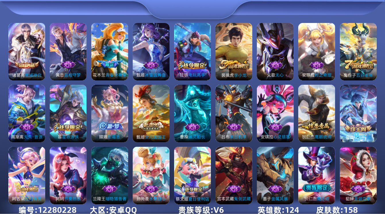 [12280228]V6 1典藏 124英雄 158皮肤 可修改实名 优质装备:星域神启(倪克斯贼亮) 珍宝阁皮:万物之道,女武神 限定皮:五谷丰年,李小龙,青春决赛季,女儿国国王,匿光启智者 史诗皮:百相守梦-黄忠,江河有灵,百解令(蒙犽),末日机甲-吕布,节奏热浪,摇滚巨星,水果甜心,天才门将,心灵骇客,时之奇旅-安琪拉,功夫厨神,暗隐猎兽者,幽灵船长,鬼剑武藏,拒霜思,逐浪之夏,龙鼓争鸣,热力回旋,金属风暴,圣诞恋歌,鹰眼统帅,暗夜贵公子,魅力维加斯,天秀·音浪,无心