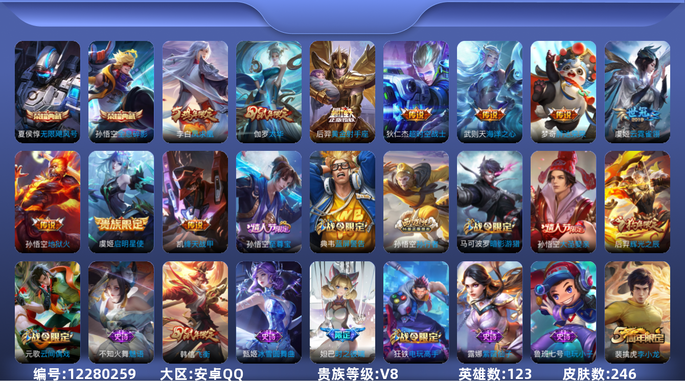 [12280259]V8 2典藏 10传说 123英雄 246皮肤 典藏英雄武则天 可修改实名 优质装备:无限飓风号(高达),全息碎影(猴子典藏),黄金射手座,绛天战甲(鸡嘴战神),云霓雀翎,地狱火,海洋之心,胖达荣荣,超时空战士-狄仁杰 珍宝阁皮:蔷薇恋人 限定皮:至尊宝,凤求凰(白切鸡),太华(伽罗年限),时之彼端,飞衡(韩信年限),五谷丰年,幽恒(沐浴露),梁祝,李小龙,辉光之辰,如梦令-后羿,孙行者,大圣娶亲 史诗皮:紫霞仙子,苍穹之光,电玩小子(小书包),特工魅影,魅语,冰冠公主,偶像歌手,暗夜猫娘,龙骑士(小龙虾),猫狗日记-孙策,时之恋人-孙尚香,节奏热浪,女仆咖啡,水果甜心,天才门将,星夜王子,心灵骇客,功夫厨神,暗隐猎兽者,鬼剑武藏,舞动绿茵,地狱岩魂,纤云弄巧,繁星吟游(呼啦呼啦),缤纷独角兽,乘风破浪,逐浪之夏,曙光守护者,箭羽风息,金属风暴,原初追逐者,鹰眼统帅,未来纪元-赵云