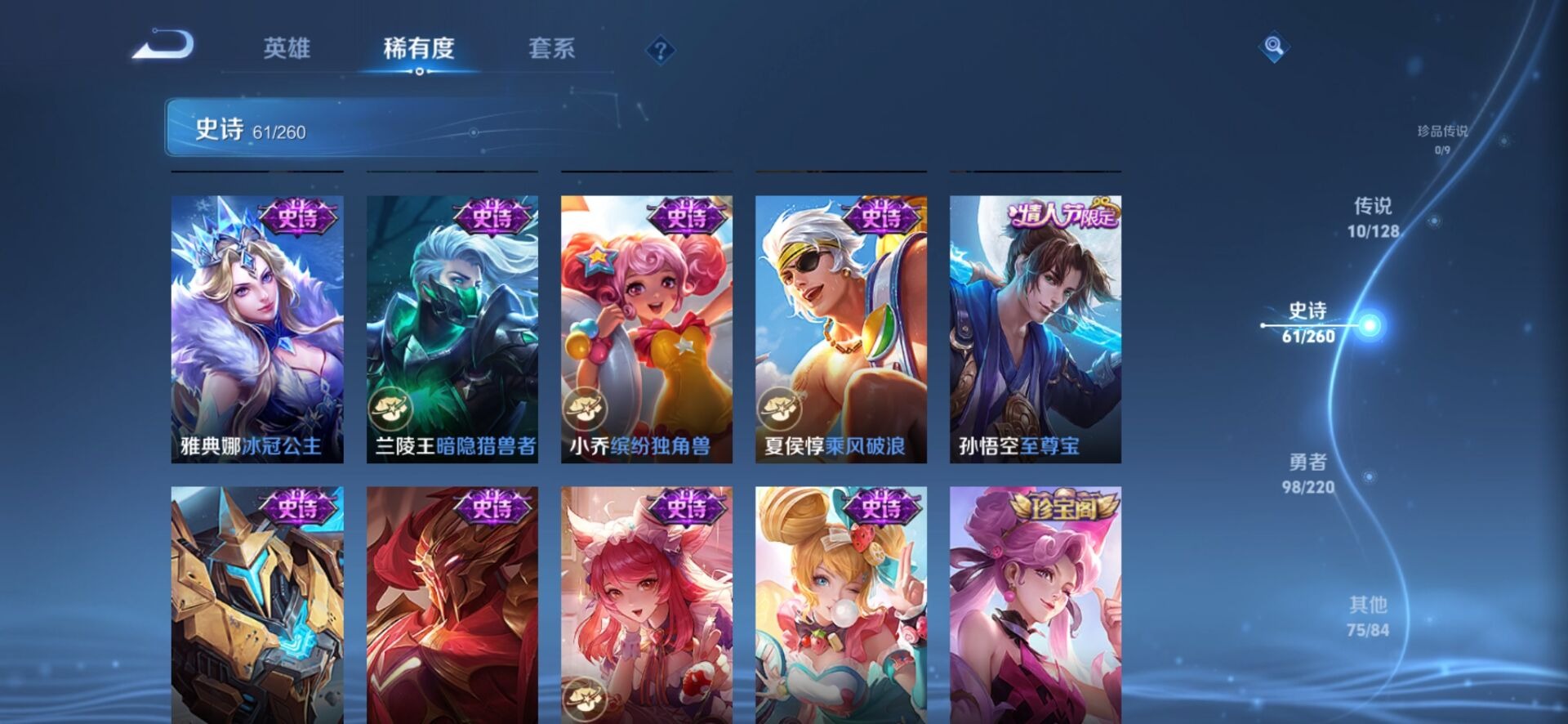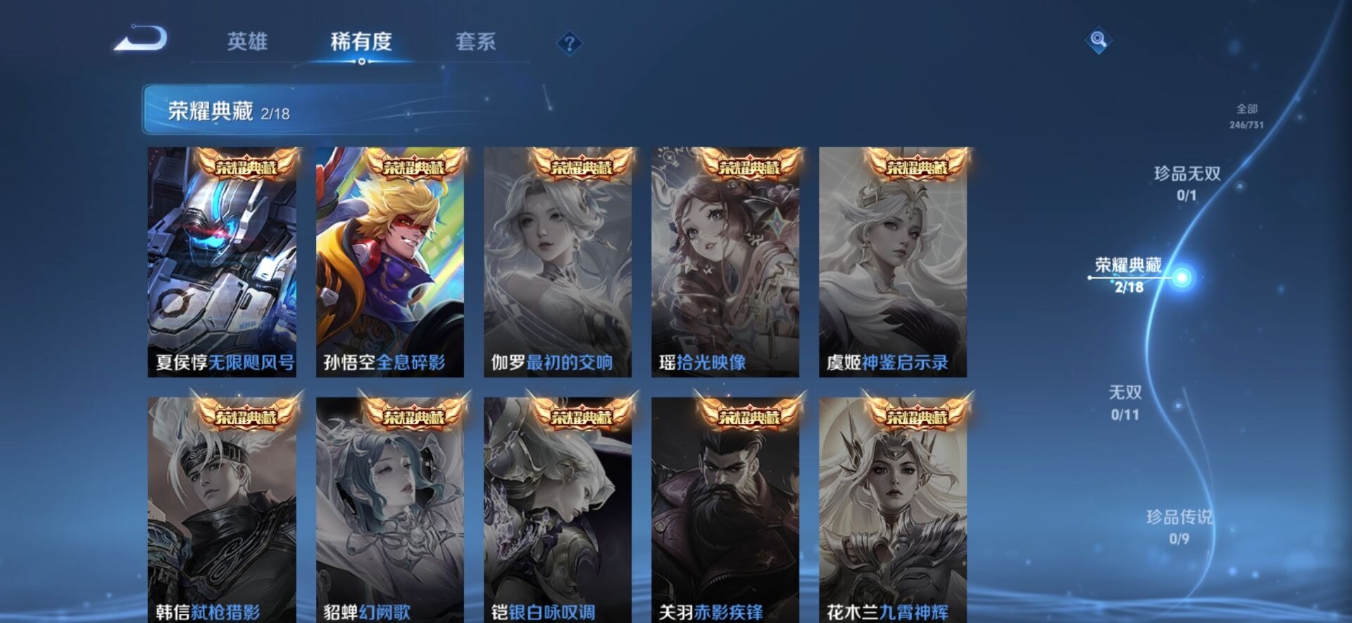 甄姬幽恒,伽罗太华,后羿如梦令,后羿辉光之辰,裴擒虎李小龙,上官婉儿梁祝,孙悟空孙行者,孙悟空大圣娶亲,孙悟空至尊宝,妲己时之彼端,韩信飞衡