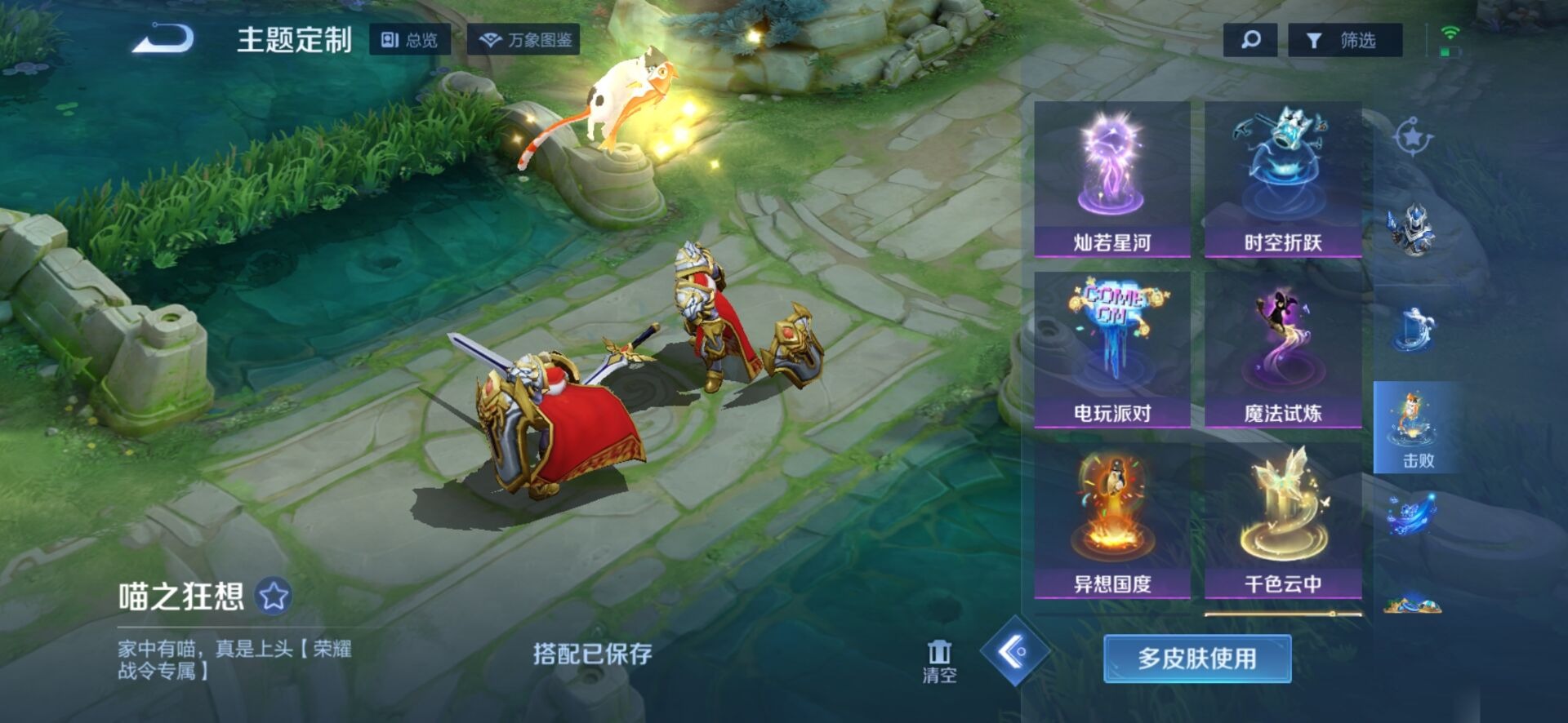 刘邦夺宝奇兵,夏侯惇朔风刀,老夫子醍醐杖,沈梦溪星空之诺,沈梦溪大漠名商,盾山御銮,苏烈千军破阵,典韦蓝屏警告,达摩沙漠行僧,牛魔御旌,鲁班七号狮舞东方,吕布猎兽之王,元歌云间偶戏,兰陵王金庭之子,裴擒虎擒涛扼浪,明世隐疑决卦,蒙犽狂想玩偶喵,马可波罗暗影游猎,鬼谷子原初探秘者,女娲朔望之晖,桑启海盐诗旅,狄仁杰万华元夜,嬴政白昼王子,程咬金演武夺筹,李元芳银河之约,李元芳云中旅人,弈星混沌棋,米莱狄御霄,钟馗神迹守卫,钟馗驱傩正仪,狂铁御狮