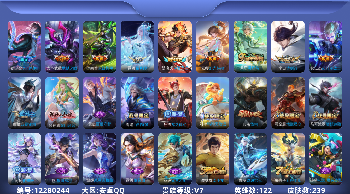 [12280244]V7 10传说 122英雄 239皮肤 可修改实名 优质装备:云霓雀翎,末日机甲-孙尚香(绿蚂蚱),地狱之眼,超时空战士-狄仁杰,霜月吟,涂山容容 传说皮:九山相柳,祥瑞亨通,幻光神枪 珍宝阁皮:蔷薇恋人 限定皮:逐霄战戟,鸣野蒿,诗剑行,降魔,五谷丰年,岱宗(典韦年限),李小龙 史诗皮:鸭鸭历险记-刘禅,狼魂孤将,绮世丹青,瑰影绮梦,化蝶舞,星界战将,龙之律动,百相守梦-周瑜,茶境仙,破空之剑,琥珀纪元伽罗,蔬乡物语(鲁班七号),百相守梦-百里守约,星界特工,百相守梦-黄忠,紫霞仙子,黄金分割率,江河有灵,百解令(蒙犽),高渐离燃音魔法,冰冠公主,青蛇,偶像歌手,电玩·爆裂旋风,末日机甲-吕布,节奏热浪,女仆咖啡,水果甜心,天才门将,星夜王子,心灵骇客,功夫厨神,德古拉伯爵,暗隐猎兽者,幽灵船长,鬼剑武藏,乐园奇幻夜,地狱岩魂,纤云弄巧,拒霜思,缤纷独角兽,逐浪之夏,水晶猎龙者,金属风暴,圣诞狂欢,圣诞恋歌,鹰眼统帅,魅力维加斯,未来纪元-赵云