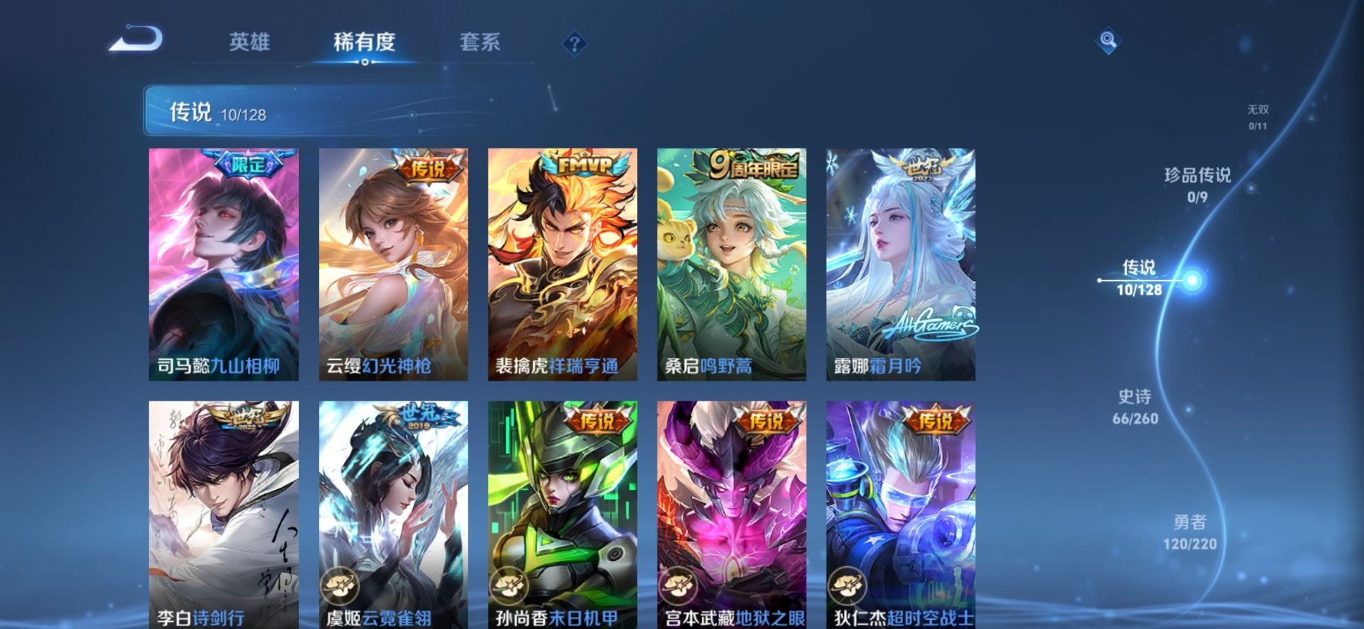 - [11879165]V7 1珍品传说 4传说 121英雄 185皮肤 可修改实名 优质装备:仲夏夜之梦(大飞蛾),超时空战士-狄仁杰,花朝如约(花篮子),妄想实况 珍品传说:时之奇旅-孙策 限定皮:遇见飞天,五谷丰年,冰锋战神,天狼狩猎者,大圣娶亲 史诗皮:器灵·浮梦炉,狼魂孤将,谪仙醉月,破空之剑,决胜骁骑,百相守梦-百里守约,遇见神鹿,紫霞仙子,黄金分割率,千年之狐,青蛇,末日机甲-吕布,猫狗日记-孙策,女仆咖啡,摇滚巨星,水果甜心,心灵骇客,德古拉伯爵,鬼剑武藏,繁星吟游(呼啦呼啦),箭羽风息,金属风暴,圣诞狂欢,鹰眼统帅,魅力维加斯,无心