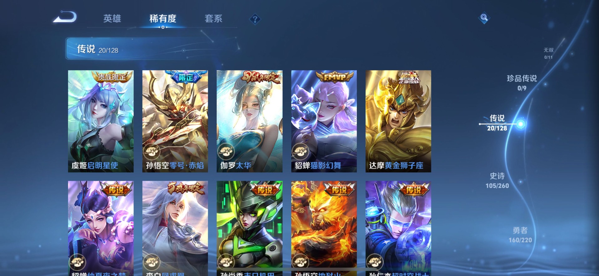 甄姬女儿国国王,铠青龙志,曹操天狼征服者,伽罗太华,赵云龙胆,孙膑天狼运算者,孙尚香异界灵契,项羽霸王别姬,后羿如梦令,庄周云端筑梦师,裴擒虎李小龙,上官婉儿梁祝,花木兰默契交锋,花木兰青春决赛季,马可波罗逐梦之星,桑启鸣野蒿,猪八戒猪悟能,孙悟空孙行者,孙悟空大圣娶亲,孙悟空至尊宝,芈月白晶晶,马超神威,韩信飞衡,虞姬霸王别姬,嫦娥如梦令