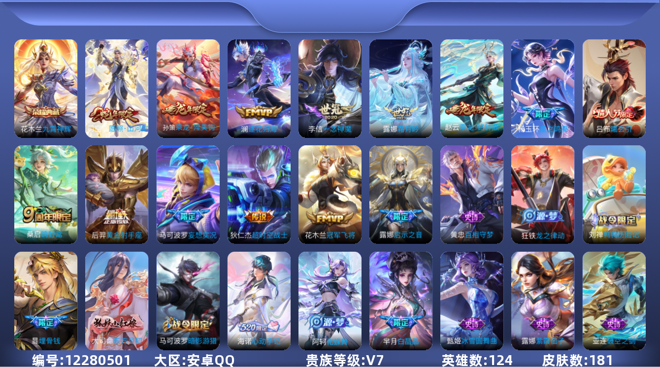 [12280501]V7 1典藏 14传说 124英雄 181皮肤 可修改实名 优质装备:九霄神辉(木兰典藏),黄金射手座,冠军飞将,一念神魔,超时空战士-狄仁杰,妄想实况,霜月吟,澜逐花归海 传说皮:乘龙·铭钟鼎(赵云年限),乘龙·淬吴钩(孙策年限),吕布曦玄引,星之鸣奏 珍宝阁皮:优雅恋人 限定皮:愿照·山河定(司空震年限),鸣野蒿,白晶晶,启示之音 史诗皮:鸭鸭历险记-刘禅,化蝶舞,星界战将,龙之律动,茶境仙,破空之剑,东方月初,蒙犽顽岩魄,埋骨钱,海诺心动手记,琥珀纪元伽罗,蔬乡物语(鲁班七号),百相守梦-百里守约,百相守梦-黄忠,紫霞仙子,特工魅影,百解令(蒙犽),高渐离燃音魔法,冰冠公主,青蛇,偶像歌手,暗夜猫娘,乱世虎臣,节奏热浪,水果甜心,星夜王子,功夫厨神,德古拉伯爵,幽灵船长,鬼剑武藏,暗渊魔法,乐园奇幻夜,天秀·启明,地狱岩魂,纤云弄巧,繁星吟游(呼啦呼啦),拒霜思,乘风破浪,逐浪之夏,水晶猎龙者,曙光守护者,金属风暴,原初追逐者,鹰眼统帅,魅力维加斯,雪上飞焰,玫瑰异探