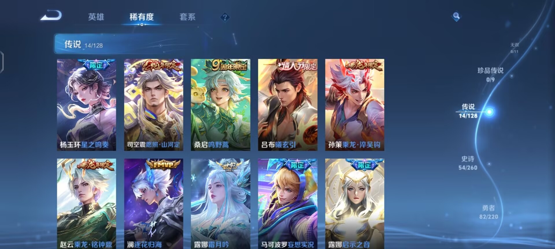 - [12030627]V8 1典藏 12传说 124英雄 302皮肤 可修改实名 优质装备:星域神启(倪克斯贼亮),黄金狮子座,炽阳神光,淬星耀世,碎云,山海·炽霜斩(李信年限),浮生妄,鹤羽星尊 传说皮:幻光神枪 珍宝阁皮:万物之道,女武神,玩趣恶龙 限定皮:愿照·九州拓(澜年限),鸣野蒿,至尊宝,神威(电光马子),飞衡(韩信年限),遇见飞天,高山流水,怒海麟威,五谷丰年,青龙志(铠年限),天狼运算者,游园惊梦,梁祝,李小龙,大圣娶亲,引擎之心,冰霜恋舞曲,唐三藏,神器·万象笔 史诗皮:灵蛊蚀心,星界战将,龙之律动,石田雨龙,炽弈燎原,蒙犽顽岩魄,电玩小子(小书包),黄金分割率,特工魅影,江河有灵,蒙恬荣光圣徽,冰冠公主,偶像歌手,白蛇,晚萤,电玩·爆裂旋风,暗夜猫娘,百相守梦(关羽),龙骑士(小龙虾),猫狗日记-孙策,猫狗日记-大乔,时之恋人-孙尚香,乱世虎臣,节奏热浪,女仆咖啡,摇滚巨星,水果甜心,天才门将,星夜王子,功夫厨神,德古拉伯爵,暗隐猎兽者,幽灵船长,鬼剑武藏,心灵战警,舞动绿茵,地狱岩魂,纤云弄巧,乘风破浪,逐浪之夏,水晶猎龙者,曙光守护者,唤灵魅影,金属风暴,原初追逐者,圣诞狂欢,圣诞恋歌,鹰眼统帅,暗夜贵公子,魅力维加斯,黎明之约,滕王阁序,无心,未来纪元-赵云