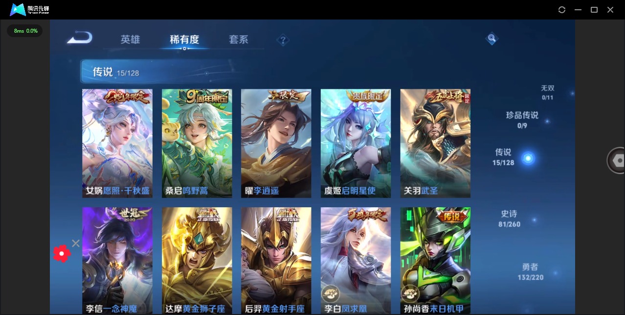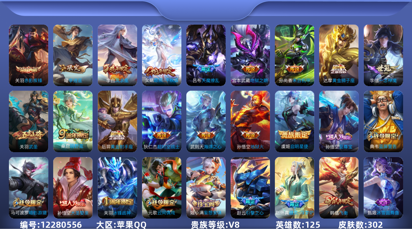 [12280556]V8 1典藏 15传说 125英雄 302皮肤 典藏英雄武则天 可修改实名 优质装备:赤影疾锋,黄金狮子座,黄金射手座,一念神魔,末日机甲-孙尚香(绿蚂蚱),地狱火,海洋之心,地狱之眼,李逍遥,超时空战士-狄仁杰 珍宝阁皮:妄想食味,蔷薇恋人 限定皮:愿照·千秋盛(女娲年限),鸣野蒿,至尊宝,凤求凰(白切鸡),飞衡(韩信年限),遇见飞天,五谷丰年,冰锋战神,武圣,游园惊梦,梁祝,龙胆,李小龙,大圣娶亲,引擎之心,天魔缭乱 史诗皮:器灵·浮梦炉,怒海争锋,蒙犽顽岩魄,蔬乡物语(鲁班七号),紫霞仙子,白龙吟,黄金分割率,特工魅影,千年之狐,江河有灵,冰冠公主,偶像歌手,暗夜猫娘,龙骑士(小龙虾),末日机甲-吕布,猫狗日记-孙策,猫狗日记-大乔,乱世虎臣,节奏热浪,女仆咖啡,摇滚巨星,水果甜心,绅士熊喵,天才门将,星夜王子,心灵骇客,功夫厨神,德古拉伯爵,暗隐猎兽者,幽灵船长,鬼剑武藏,心灵战警,乐园奇幻夜,舞动绿茵,地狱岩魂,诗语江南,纤云弄巧,繁星吟游(呼啦呼啦),拒霜思,缤纷独角兽,乘风破浪,逐浪之夏,水晶猎龙者,曙光守护者,箭羽风息,金属风暴,原初追逐者,圣诞狂欢,圣诞恋歌,鹰眼统帅,暗夜贵公子,魅力维加斯,未来纪元-赵云