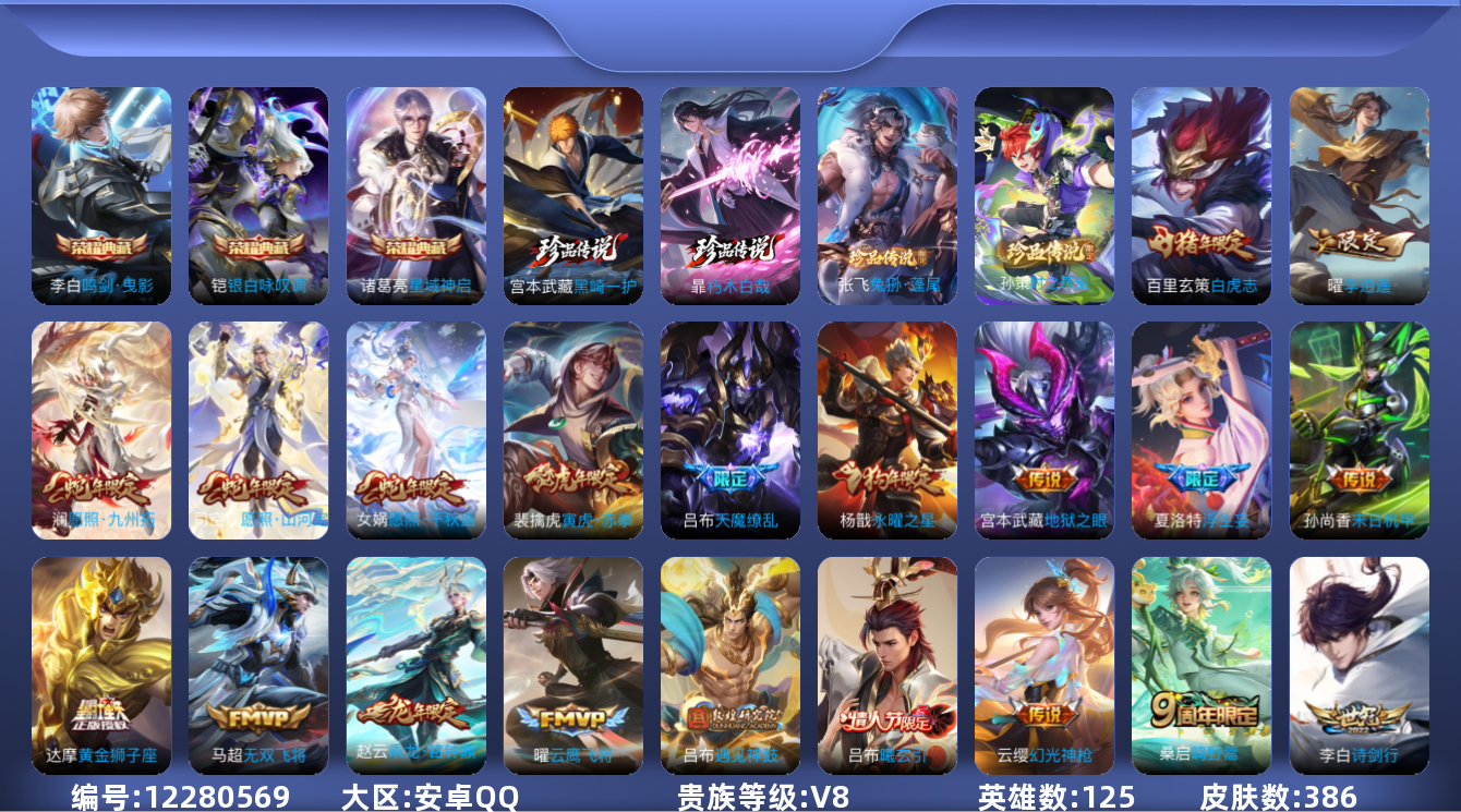 [12280569]V8 3典藏 4珍品传说 24传说 125英雄 386皮肤 可修改实名 优质装备:鸣剑·曳影,星域神启(倪克斯贼亮),银白咏叹调(倪克斯侍卫),朽木白哉,黑崎一护,黄金狮子座,云鹰飞将(小将军),末日机甲-孙尚香(绿蚂蚱),地狱之眼,李逍遥,时之恋人-刘备(电焊工),超时空战士-狄仁杰,无双飞将,浮生妄,遇见神鼓,涂山容容 珍品传说:时之奇旅-孙策,兔狲·蓬尾 传说皮:乘龙·铭钟鼎(赵云年限),吕布曦玄引,幻光神枪 珍宝阁皮:妄想食味,蔷薇恋人,女武神 限定皮:愿照·九州拓(澜年限),愿照·山河定(司空震年限),愿照·千秋盛(女娲年限),逐霄战戟,鸣野蒿,至尊宝,白虎志(电光耗子),白晶晶,神威(电光马子),遇见飞天,高山流水,诗剑行,怒海麟威,五谷丰年,冰锋战神,游园惊梦,梁祝,御风骁将(吕布年限),天狼狩猎者,天狼征服者,李小龙,永曜之星,霸王别姬-项羽,真爱至上,天魔缭乱,冰霜恋舞曲,神奇女侠,寅虎·赤拳(老虎年限),玉兔公主 史诗皮:赞萌露比,鸭鸭历险记-刘禅,苍鳞隐世,化蝶舞,星界战将,龙之律动,百相守梦-周瑜,戍鼓铭心,怒海争锋,战舞者,蔬乡物语(鲁班七号),百相守梦-百里守约,百相守梦-黄忠,织梦人,守夜人,紫霞仙子,苍穹之光,电玩小子(小书包),黄金分割率,特工魅影,千年之狐,永昼,江河有灵,雪夜绮愿(周瑜),魅语,百解令(蒙犽),蒙恬荣光圣徽,无限星赏官,冰冠公主,偶像歌手,暗夜猫娘,末日机甲-吕布,猫狗日记-孙策,猫狗日记-大乔,乱世虎臣,节奏热浪,修罗,女仆咖啡,摇滚巨星,水果甜心,绅士熊喵,天才门将,星夜王子,心灵骇客,功夫厨神,德古拉伯爵,暗隐猎兽者,幽灵船长,鬼剑武藏,心灵战警,乐园奇幻夜,天秀·启明,地狱岩魂,纤云弄巧,繁星吟游(呼啦呼啦),拒霜思,缤纷独角兽,乘风破浪,逐浪之夏,月团寄思,水晶猎龙者,曙光守护者,箭羽风息,金属风暴,原初追逐者,圣诞狂欢,圣诞恋歌,鹰眼统帅,暗夜贵公子,魅力维加斯,黎明之约,滕王阁序,无心,未来纪元-赵云