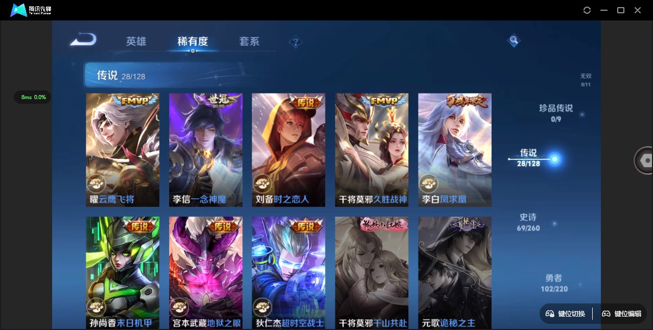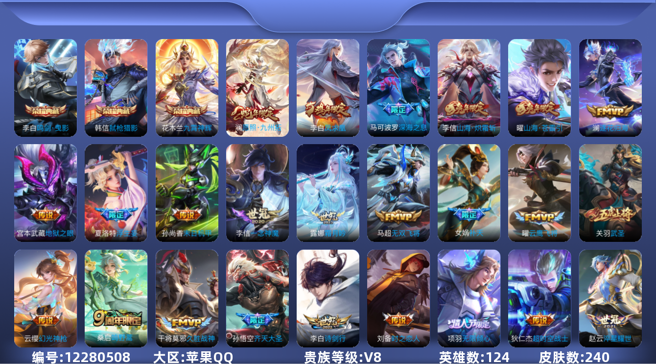 [12280508]V8 3典藏 28传说 124英雄 240皮肤 可修改实名 优质装备:鸣剑·曳影,九霄神辉(木兰典藏),弑枪猎影(韩信典藏),云鹰飞将(小将军),绛天战甲(鸡嘴战神),久胜战神,一念神魔,末日机甲-孙尚香(绿蚂蚱),地狱之眼,时之恋人-刘备(电焊工),淬星耀世,超时空战士-狄仁杰,花朝如约(花篮子),无双飞将,山海·炽霜斩(李信年限),山海·苍雷引(电光曜子),燃星之曲,浮生妄,霜月吟,澜逐花归海 传说皮:幻光神枪 珍宝阁皮:女武神,玩趣恶龙 限定皮:愿照·九州拓(澜年限),逐霄战戟,鸣野蒿,至尊宝,凤求凰(白切鸡),补天,山海·碧波行(瑶年限),无限倾心-项羽,诗剑行,齐天大圣,五谷丰年,冰锋战神,武圣,天狼运算者,游园惊梦,天狼狩猎者,玄武志(苏烈年限),朱雀志(守约年限),默契交锋-花木兰,孙行者,云端筑梦师,深海之息(深海大菠萝),山海·玄木吟(马可年限) 史诗皮:化蝶舞,石田雨龙,茶境仙,百相守梦-黄忠,紫霞仙子,电玩小子(小书包),黄金分割率,江河有灵,魅语,蒙恬荣光圣徽,偶像歌手,电玩·爆裂旋风,百相守梦(刘备),末日机甲-吕布,猫狗日记-孙策,猫狗日记-大乔,乱世虎臣,修罗,女仆咖啡,摇滚巨星,水果甜心,天才门将,星夜王子,心灵骇客,功夫厨神,暗隐猎兽者,幽灵船长,鬼剑武藏,心灵战警,乐园奇幻夜,舞动绿茵,地狱岩魂,缤纷独角兽,乘风破浪,逐浪之夏,水晶猎龙者,曙光守护者,箭羽风息,金属风暴,原初追逐者,圣诞狂欢,圣诞恋歌,鹰眼统帅,魅力维加斯,赏金猎手,无心,未来纪元-赵云