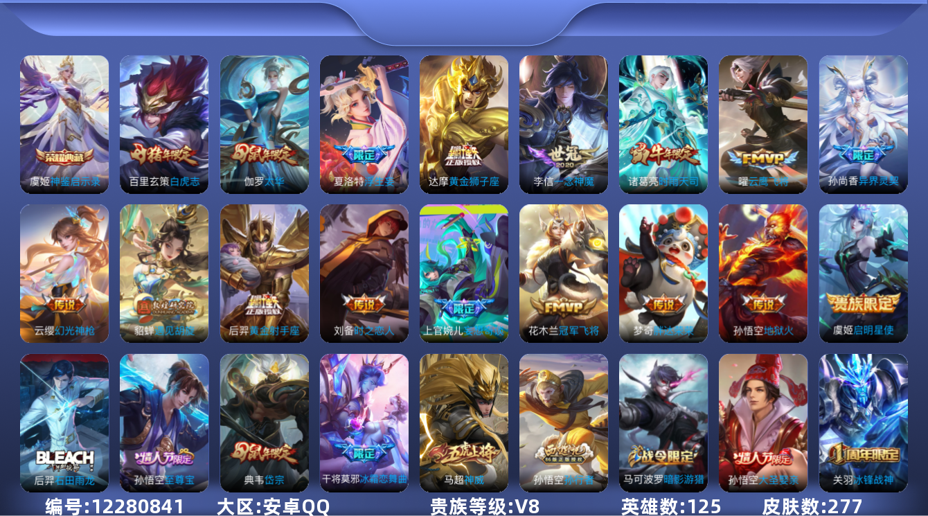 [12280841]V8 1典藏 17传说 125英雄 277皮肤 可修改实名 优质装备:神鉴启示录,黄金狮子座,黄金射手座,冠军飞将,云鹰飞将(小将军),一念神魔,地狱火,胖达荣荣,时之恋人-刘备(电焊工),遇见胡旋,浮生妄,妄想奇谈 传说皮:幻光神枪 珍宝阁皮:妄想食味,胡桃夹子,蔷薇恋人,女武神 限定皮:至尊宝,白虎志(电光耗子),太华(伽罗年限),异界灵契(白毛香),时之彼端,时雨天司(水龙头),神威(电光马子),飞衡(韩信年限),高山流水,五谷丰年,冰锋战神,幽恒(沐浴露),岱宗(典韦年限),天狼绘梦者,李小龙,朱雀志(守约年限),如梦令-嫦娥,如梦令-后羿,真爱至上,孙行者,猪悟能,大圣娶亲,青春决赛季,冰霜恋舞曲,神奇女侠,匿光追影者,山海·玄木吟(马可年限) 史诗皮:石田雨龙,千年之狐,高渐离燃音魔法,蒙恬荣光圣徽,冰冠公主,电玩·爆裂旋风,百相守梦(关羽),末日机甲-吕布,猫狗日记-孙策,猫狗日记-大乔,乱世虎臣,修罗,摇滚巨星,水果甜心,天才门将,时之奇旅-安琪拉,功夫厨神,德古拉伯爵,暗隐猎兽者,鬼剑武藏,心灵战警,舞动绿茵,纤云弄巧,繁星吟游(呼啦呼啦),拒霜思,乘风破浪,逐浪之夏,水晶猎龙者,曙光守护者,金属风暴,原初追逐者,鹰眼统帅,王者之锤,魅力维加斯,黎明之约,无心,未来纪元-赵云