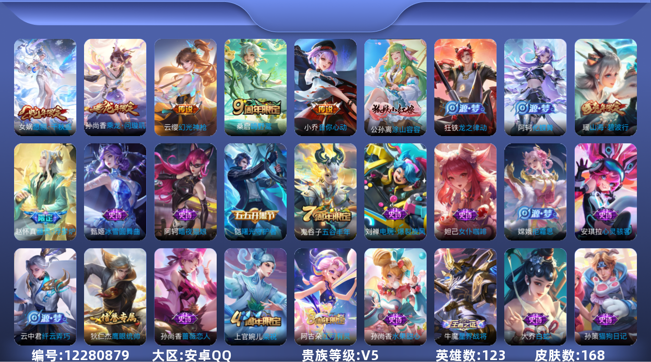 [12280879]V5 5传说 123英雄 168皮肤 可修改实名 优质装备:音你心动-小乔,涂山容容 传说皮:乘龙·问璇玑(孙尚香年限),幻光神枪 珍宝阁皮:蔷薇恋人,女武神 限定皮:愿照·千秋盛(女娲年限),逐霄战戟,鸣野蒿,山海·碧波行(瑶年限),五谷丰年,梁祝 史诗皮:器灵·浮梦炉,化蝶舞,星界战将,龙之律动,蒙犽顽岩魄,蔬乡物语(鲁班七号),江河有灵,蒙恬荣光圣徽,偶像歌手,白蛇,电玩·爆裂旋风,暗夜猫娘,猫狗日记-孙策,乱世虎臣,女仆咖啡,摇滚巨星,水果甜心,绅士熊喵,天才门将,心灵骇客,功夫厨神,鬼剑武藏,舞动绿茵,纤云弄巧,拒霜思,逐浪之夏,曙光守护者,金属风暴,圣诞恋歌,鹰眼统帅