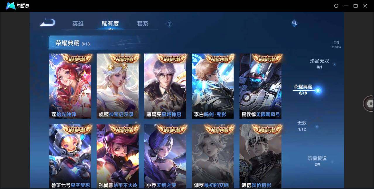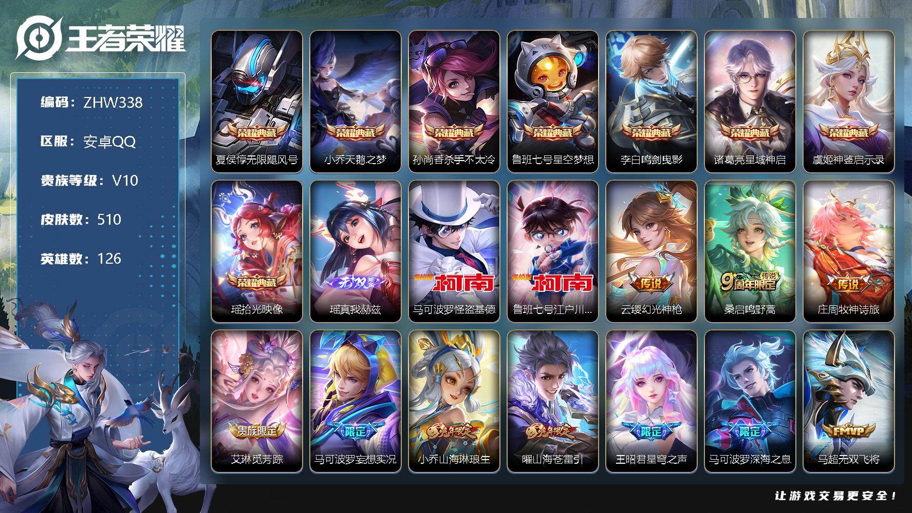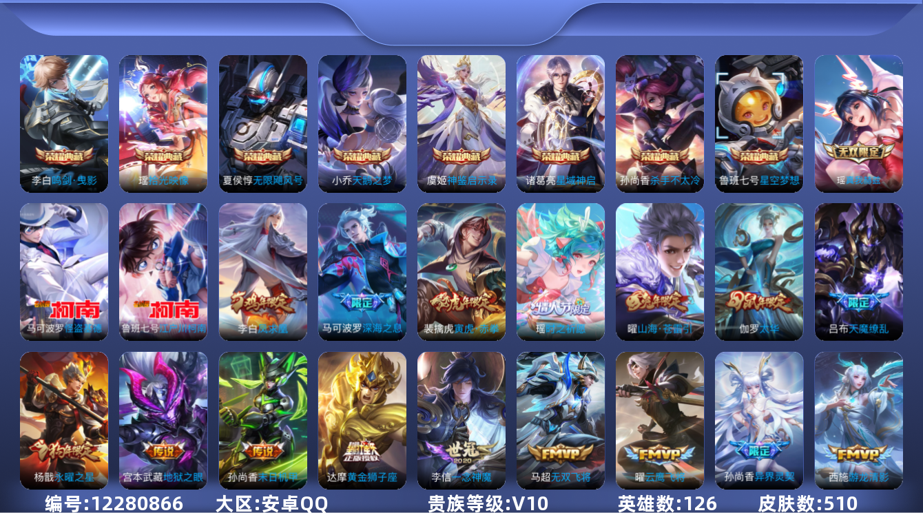 [12280866]【特价急出/详情看图】:安卓Q-V10-至尊星耀III段位-126英雄-510皮肤-8典藏-1无双-2珍品传说-41传说-173史诗