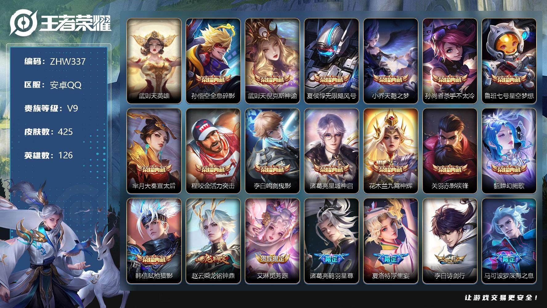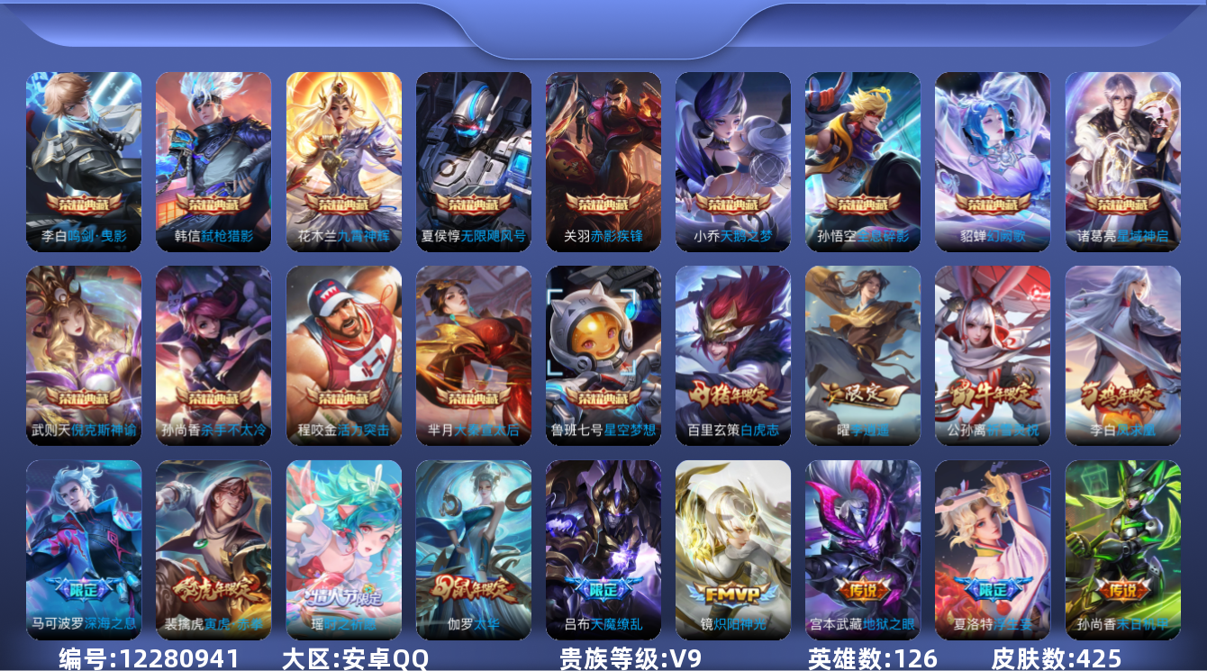 [12280941]【特价急出/详情看图】:安卓Q-V10-至尊星耀V段位-126英雄-425皮肤-15典藏-50传说-147史诗