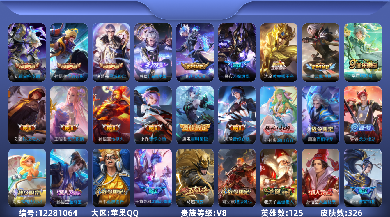 - [11572143]V8 1典藏 13传说 124英雄 307皮肤 可修改实名 信用分25分 女号 优质装备:鸣剑·曳影,黄金射手座,冠军飞将,云鹰飞将(小将军),炽阳神光,一念神魔,末日机甲-孙尚香(绿蚂蚱),地狱火,仲夏夜之梦(大飞蛾),李逍遥,超时空战士-狄仁杰,挚爱之约,无双飞将 珍宝阁皮:优雅恋人,蔷薇恋人 限定皮:至尊宝,梅西,神威(电光马子),飞衡(韩信年限),瑞麟志(木兰年限),遇见飞天,五谷丰年,冰锋战神,梁祝,天狼狩猎者,天狼溯光者,逐梦之音,李小龙,朱雀志(守约年限),如梦令-后羿,默契交锋-花木兰,纯白花嫁,一生所爱,大圣娶亲,引擎之心,青春决赛季,冰霜恋舞曲,蜜橘之夏 史诗皮:灵蛊蚀心,龙之律动,百相守梦-黄忠,紫霞仙子,电玩小子(小书包),黄金分割率,千年之狐,蒙恬荣光圣徽,无限星赏官,冰冠公主,偶像歌手,电玩·爆裂旋风,乱世虎臣,节奏热浪,修罗,女仆咖啡,摇滚巨星,水果甜心,绅士熊喵,星夜王子,心灵骇客,德古拉伯爵,暗隐猎兽者,幽灵船长,鬼剑武藏,心灵战警,舞动绿茵,地狱岩魂,纤云弄巧,缤纷独角兽,乘风破浪,逐浪之夏,水晶猎龙者,曙光守护者,金属风暴,原初追逐者,圣诞狂欢,圣诞恋歌,鹰眼统帅,王者之锤,暗夜贵公子,魅力维加斯,黎明之约,赏金猎手,无心,未来纪元-赵云