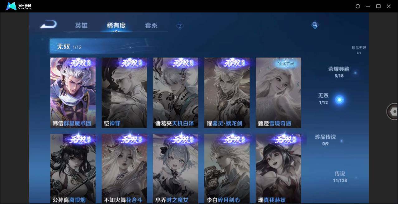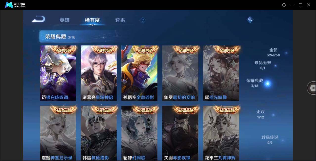 - PX_2079518-26 安卓QQ/至尊星耀/280皮肤/125英雄/2典藏/0珍品无双/1无双/1珍品传说/32传说/88史诗/9稀有英雄 【1 珍品传说】怪盗基德 马可波罗, 【2 典藏皮肤】神鉴启示录 虞姬,九霄神辉 花木兰, 【1 无双皮肤】花合斗 不知火舞, 【32 传说皮肤】星穹之声 王昭君,启明星使 虞姬,云霓雀翎 虞姬,前尘镜 娜可露露,无限倾心 虞姬,碎云 百里守约,无双飞将
