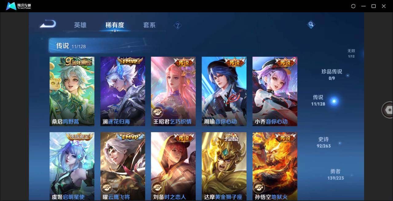 【传说皮肤】:桑启鸣野蒿,澜逐花归海,王昭君乞巧织情,周瑜音你心动,小乔音你心动,虞姬启明星使,曜云鹰飞将,刘备时之恋人,达摩黄金狮子座,孙悟空地狱火,吕布天魔缭乱
