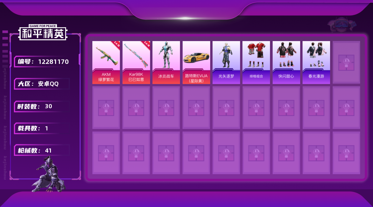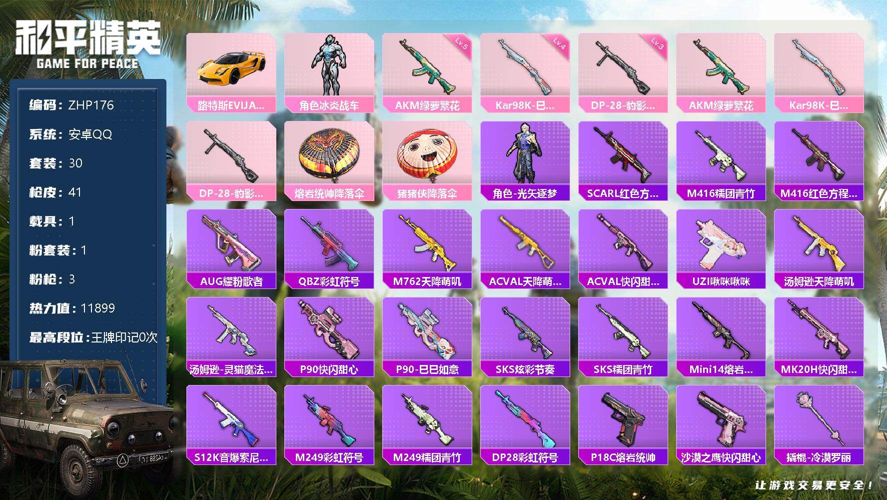 [12281170]【特价急出/详情看图】:安卓 手Q-1粉装-3特效枪-1载具-1.1w热力值-2王牌印记-30套装-41枪皮【粉色载具】:路特斯EVIJA(星际黄)【粉色套装】:角色-冰炎战车【粉色枪皮等级】:AKM-绿萝繁花(五级),Kar98K-巳巳如意(四级),DP-28-豹影疾电(三级)