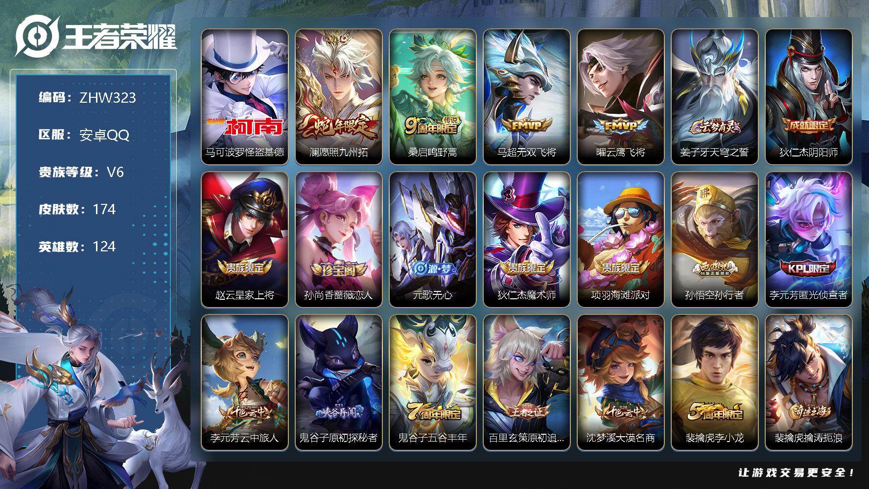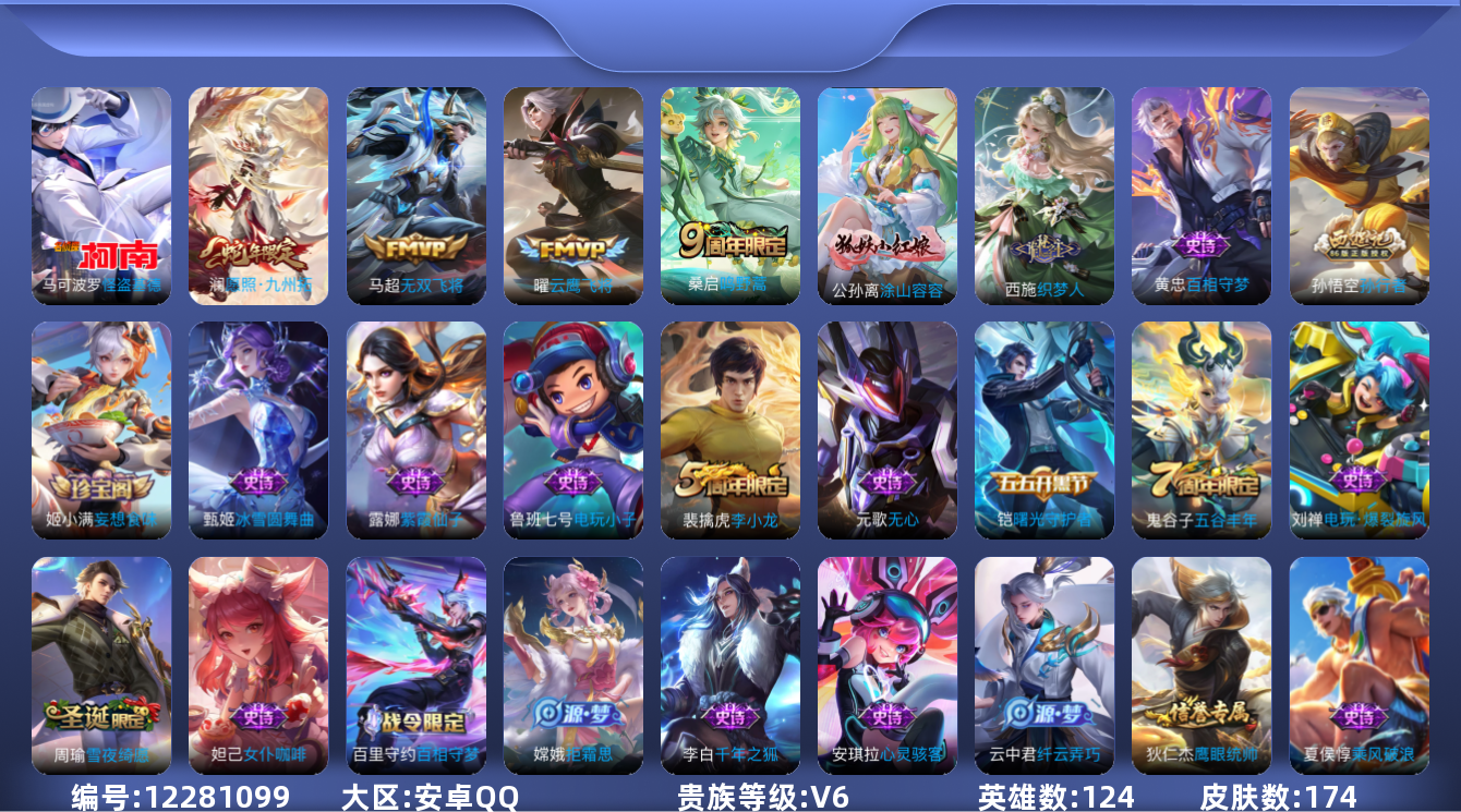 [12281099]【特价急出/详情看图】:安卓Q-V6-至尊星耀IV段位-124英雄-174皮肤-1珍品传说-4传说-54史诗