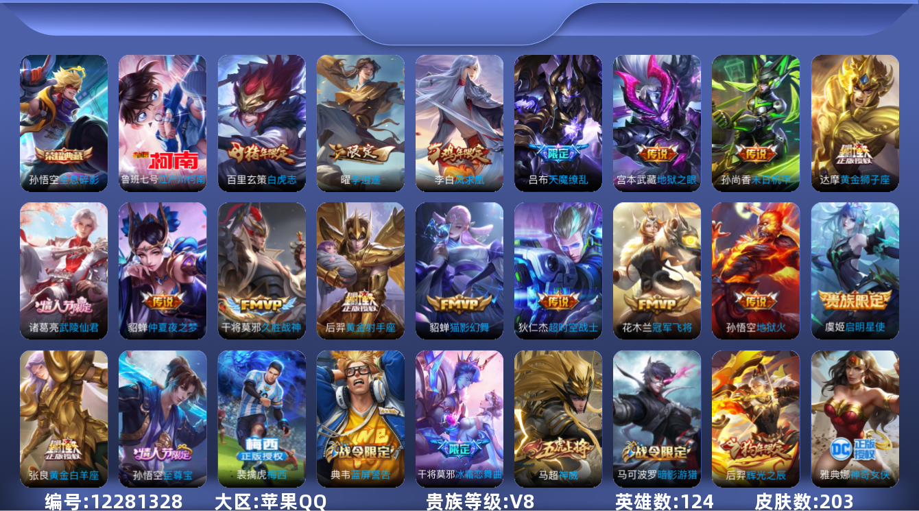 [12281328]V8 1典藏 1珍品传说 17传说 124英雄 203皮肤 可修改实名 优质装备:全息碎影(猴子典藏),江户川柯南,黄金狮子座,黄金射手座,冠军飞将,黄金白羊座,猫影幻舞,久胜战神,末日机甲-孙尚香(绿蚂蚱),地狱火,仲夏夜之梦(大飞蛾),地狱之眼,李逍遥,超时空战士-狄仁杰 珍宝阁皮:优雅恋人 限定皮:逐霄战戟,至尊宝,白虎志(电光耗子),凤求凰(白切鸡),梅西,武陵仙君(小桃花),魔法小厨娘,神威(电光马子),飞衡(韩信年限),梁祝,天狼狩猎者,天狼征服者,李小龙,辉光之辰,如梦令-后羿,天魔缭乱,冰霜恋舞曲,神奇女侠 史诗皮:紫霞仙子,电玩小子(小书包),白龙吟,黄金分割率,特工魅影,千年之狐,无限星赏官,偶像歌手,末日机甲-吕布,猫狗日记-孙策,节奏热浪,修罗,水果甜心,星夜王子,心灵骇客,功夫厨神,暗隐猎兽者,幽灵船长,鬼剑武藏,心灵战警,地狱岩魂,纤云弄巧,繁星吟游(呼啦呼啦),缤纷独角兽,乘风破浪,逐浪之夏,水晶猎龙者,曙光守护者,金属风暴,原初追逐者,圣诞狂欢,鹰眼统帅,魅力维加斯,黎明之约,赏金猎手