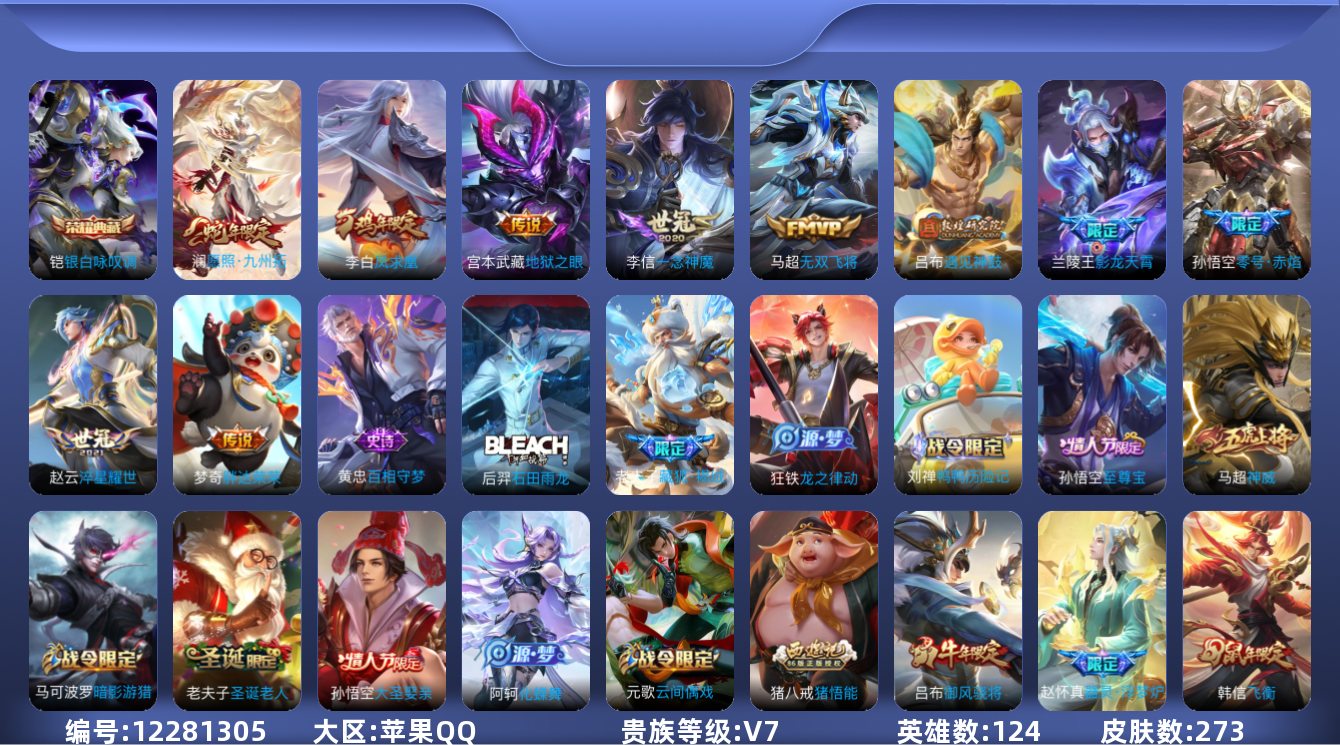 [12281305]V7 1典藏 10传说 124英雄 273皮肤 可修改实名 优质装备:银白咏叹调(倪克斯侍卫),一念神魔,零号·赤焰,地狱之眼,胖达荣荣,淬星耀世,无双飞将,遇见神鼓 珍宝阁皮:万物之道,女武神 限定皮:愿照·九州拓(澜年限),至尊宝,凤求凰(白切鸡),神威(电光马子),飞衡(韩信年限),影龙天霄,遇见飞天,五谷丰年,游园惊梦,梁祝,御风骁将(吕布年限),逐梦之翼,李小龙,逐梦之影,霸王别姬-项羽,圣诞老人,猪悟能,大圣娶亲 史诗皮:鸭鸭历险记-刘禅,苍鳞隐世,器灵·浮梦炉,化蝶舞,龙之律动,藏狐·褐绒,石田雨龙,茶境仙,芈月浮光幕影,百相守梦-黄忠,苍穹之光,黄金分割率,特工魅影,千年之狐,江河有灵,蒙恬荣光圣徽,冰冠公主,偶像歌手,电玩·爆裂旋风,猫狗日记-孙策,乱世虎臣,节奏热浪,修罗,女仆咖啡,摇滚巨星,水果甜心,绅士熊喵,星夜王子,功夫厨神,暗隐猎兽者,幽灵船长,鬼剑武藏,乐园奇幻夜,舞动绿茵,纤云弄巧,繁星吟游(呼啦呼啦),拒霜思,缤纷独角兽,乘风破浪,曙光守护者,箭羽风息,金属风暴,圣诞狂欢,圣诞恋歌,鹰眼统帅,王者之锤,暗夜贵公子,魅力维加斯,无心