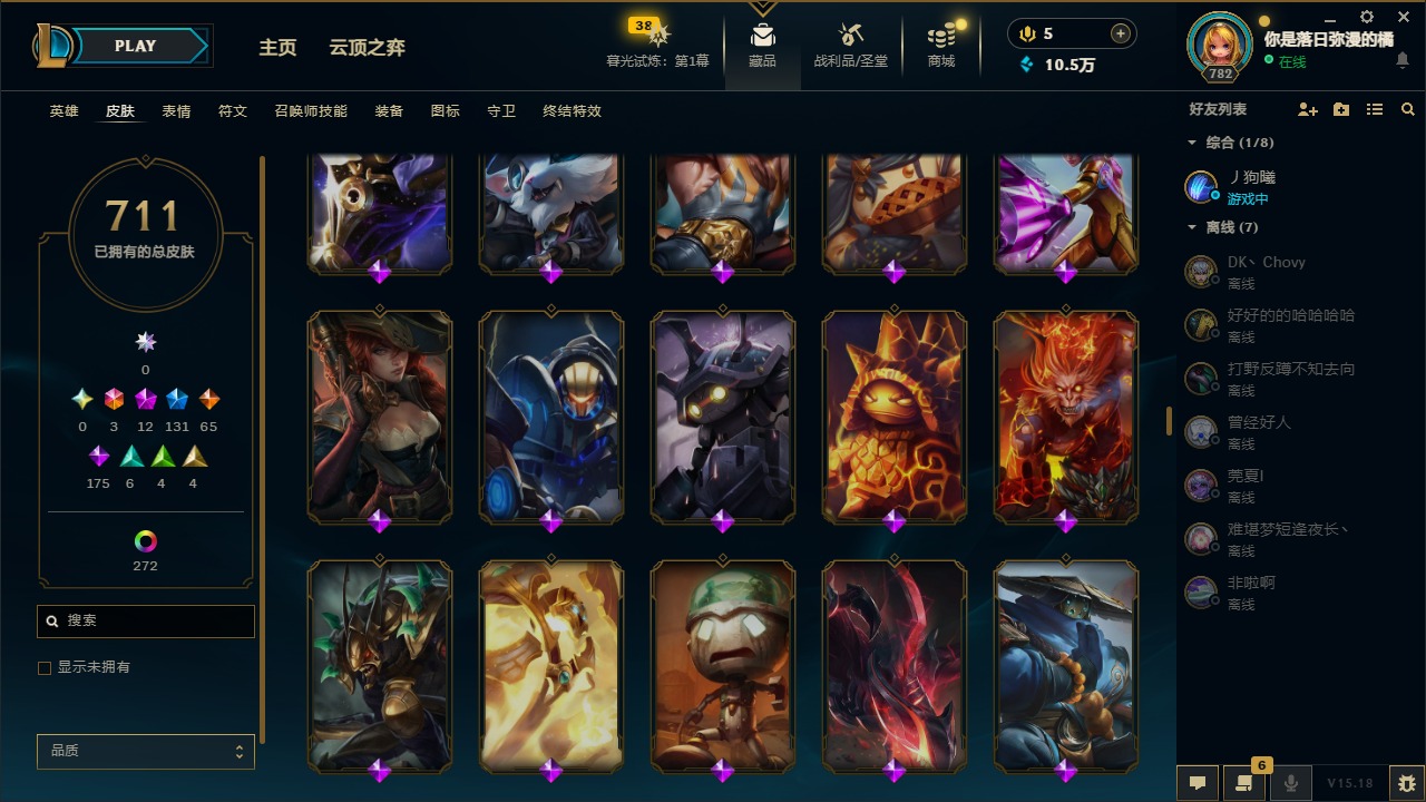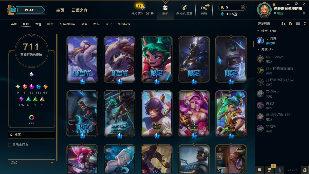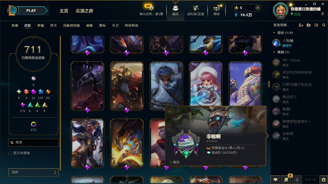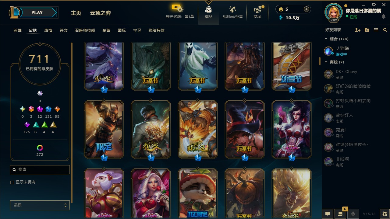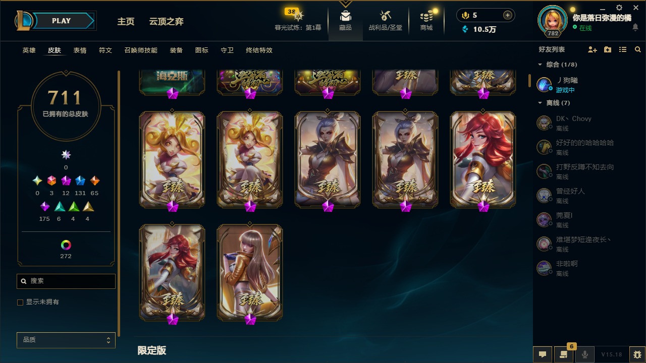 [12281384]3终极 12神话 131限定 65传说 175史诗 711皮肤 301炫彩 168英雄 可二次 可修改实名 优质装备:至臻 玉剑传说 武剑仙,至臻 战斗学院 拉克丝,至臻 K/DA 卡莎,至臻 星之守护者 妮寇,至臻 女帝 黛安娜,穿星魔锋,斩星魔剑,防爆天使 凯尔,暗影 沃里克,巧克力工坊 波比,创世纪 希维尔,地底世界 崔斯特,电玩战魂 人马,都铎王朝 图奇,防爆士兵 炼金,防爆士兵 格雷福斯,钢铁之翼 凤凰,冠军典狱长 锤石,冠军掠夺者 卡兹克,冠军之箭 艾希,冠军之矛 滑板鞋,冠军之刃 锐雯,冠军之刃 锐雯 2016,冠军之隐 劫,警用试作体K-9 内瑟斯,密林猎手 提莫,诺斯费拉图 弗拉基米尔,野兽猎人 德莱文,野兽猎人 瑟庄妮,野兽猎人 泰达米尔,勇者 阿狸,御魔星矢 寒冰,战场BOSS 吉格斯,至臻 星之守护者 艾克,大元素使,灵魂守卫,未来战士,2022 全球总决赛 阿兹尔,至臻 星之守护者 妮蔻,雾雨之刃 锐雯,冠军之刃 锐雯 2016 凯旋圣装,冠军掠夺者 卡兹克 凯旋圣装,弹幕天使 卡莎 炽天使·公正,冠军之血 希瓦娜 凯旋圣装,无畏骑士 瑟庄妮 赤子初心,外星装甲 库奇,星之守护者 金克丝 黑洞,冠军之隐 劫 凯旋圣装,至臻 星之守护者 妮蔻(2022),至臻 玉剑传说 武剑仙(2022),至臻 战斗学院 拉克丝(2022),净雪之月 莫甘娜 冬虹,银龙裁夬 泰隆 潜龙在渊,墨之影武者 亚索 金墨耀影,战斗学院 盖伦 不死鸟,十五周年纪念 希维尔,心之钢 伊泽瑞尔 天纵才华,魔女 阿卡丽 虚荣,北极星钢影 卡蜜尔 智慧纽带,幻灵战斗兔 阿萝拉 梦幻强袭,魅影之刃 锐雯,暗裔英雄 盖伦 海克斯:摄魂 薇恩 限定:奥斯曼大帝 普朗克,创星之灵 璐璐,舞会公主 安妮 情人节限定:觅心猎手 薇恩,觅心魔灵 奥利安娜,觅心女王 寒冰,甜心之翎 洛,甜心之羽 霞 赛季限定皮:胜利凤凰 艾尼维亚,胜利剑圣 易,胜利女神 娑娜,胜利巨口 克格莫,胜利之王 泰达米尔,胜利女神 莫甘娜,胜利女神 希维尔,胜利之树 茂凯,胜利之剑 剑魔,胜利枪神 卢锡安,胜利女神 瑟庄妮 冠军限定系列:S13 T1 李青,S1FNC 酒桶,S1FNC 迦娜,S1FNC 嘉文四世,S1FNC 卡尔萨斯,S1FNC 库奇,S2 暗杀星 蒙多,S2 暗杀星 努努,S2 暗杀星 慎,S