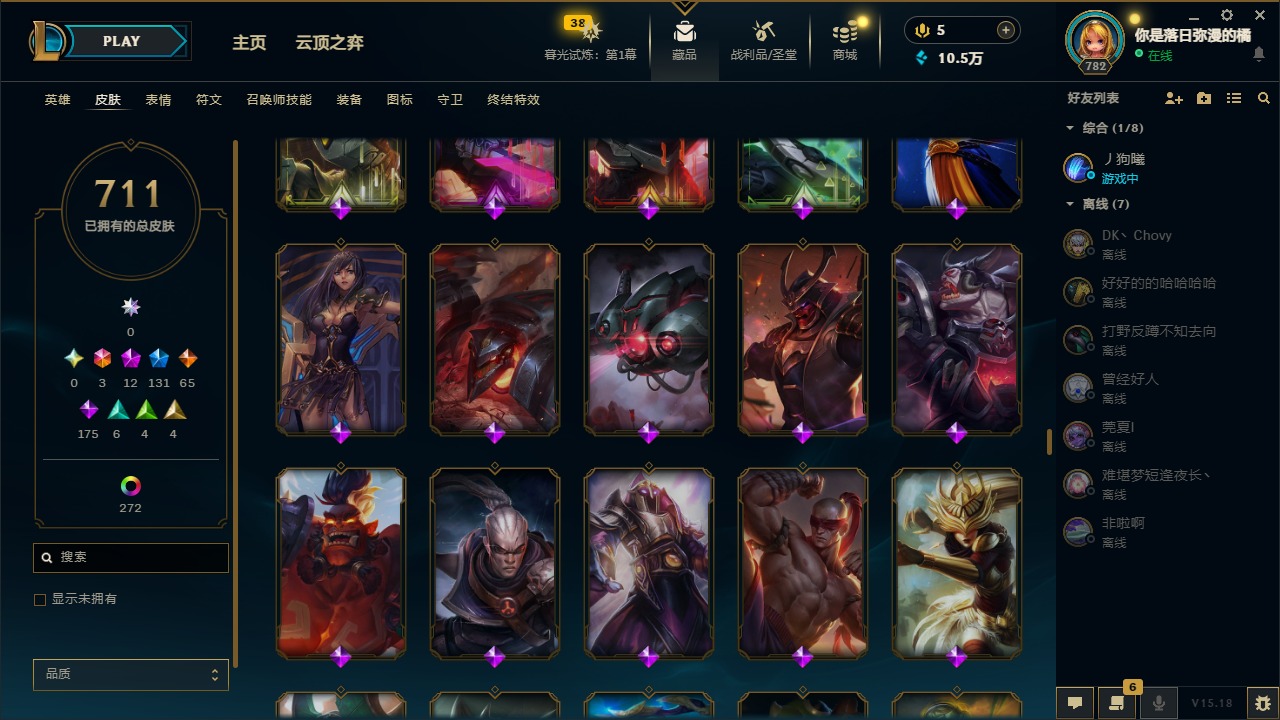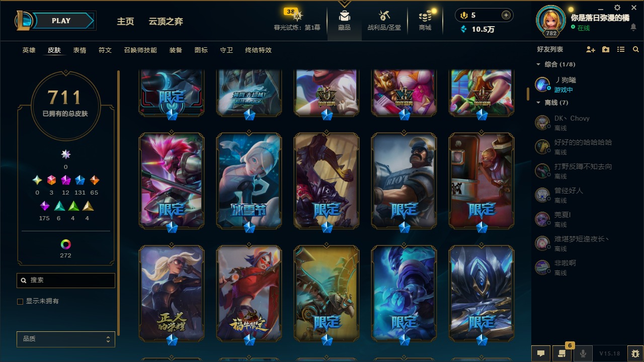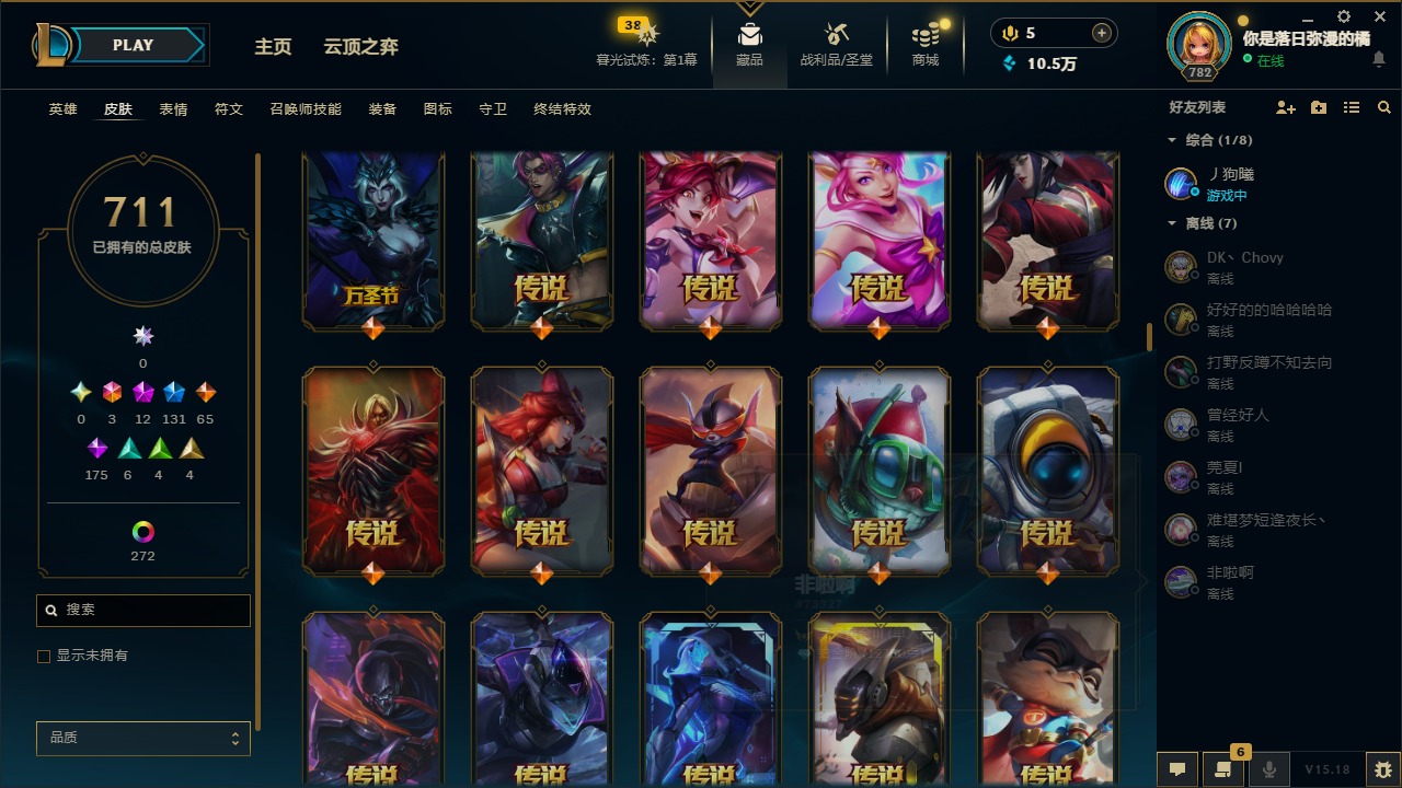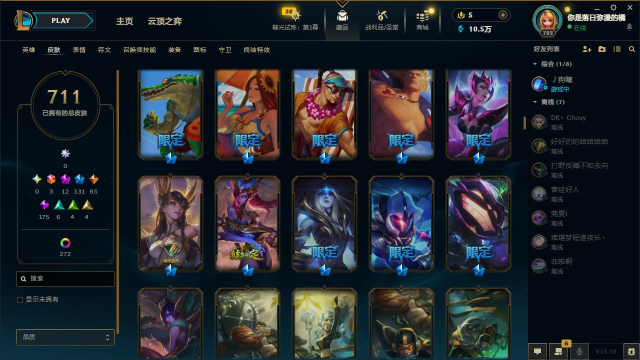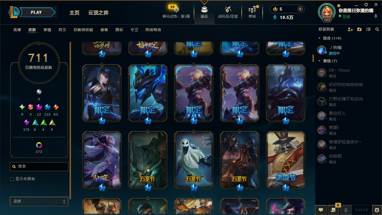 [12281384]3终极 12神话 131限定 65传说 175史诗 711皮肤 301炫彩 168英雄 可二次 可修改实名 优质装备:至臻 玉剑传说 武剑仙,至臻 战斗学院 拉克丝,至臻 K/DA 卡莎,至臻 星之守护者 妮寇,至臻 女帝 黛安娜,穿星魔锋,斩星魔剑,防爆天使 凯尔,暗影 沃里克,巧克力工坊 波比,创世纪 希维尔,地底世界 崔斯特,电玩战魂 人马,都铎王朝 图奇,防爆士兵 炼金,防爆士兵 格雷福斯,钢铁之翼 凤凰,冠军典狱长 锤石,冠军掠夺者 卡兹克,冠军之箭 艾希,冠军之矛 滑板鞋,冠军之刃 锐雯,冠军之刃 锐雯 2016,冠军之隐 劫,警用试作体K-9 内瑟斯,密林猎手 提莫,诺斯费拉图 弗拉基米尔,野兽猎人 德莱文,野兽猎人 瑟庄妮,野兽猎人 泰达米尔,勇者 阿狸,御魔星矢 寒冰,战场BOSS 吉格斯,至臻 星之守护者 艾克,大元素使,灵魂守卫,未来战士,2022 全球总决赛 阿兹尔,至臻 星之守护者 妮蔻,雾雨之刃 锐雯,冠军之刃 锐雯 2016 凯旋圣装,冠军掠夺者 卡兹克 凯旋圣装,弹幕天使 卡莎 炽天使·公正,冠军之血 希瓦娜 凯旋圣装,无畏骑士 瑟庄妮 赤子初心,外星装甲 库奇,星之守护者 金克丝 黑洞,冠军之隐 劫 凯旋圣装,至臻 星之守护者 妮蔻(2022),至臻 玉剑传说 武剑仙(2022),至臻 战斗学院 拉克丝(2022),净雪之月 莫甘娜 冬虹,银龙裁夬 泰隆 潜龙在渊,墨之影武者 亚索 金墨耀影,战斗学院 盖伦 不死鸟,十五周年纪念 希维尔,心之钢 伊泽瑞尔 天纵才华,魔女 阿卡丽 虚荣,北极星钢影 卡蜜尔 智慧纽带,幻灵战斗兔 阿萝拉 梦幻强袭,魅影之刃 锐雯,暗裔英雄 盖伦 海克斯:摄魂 薇恩 限定:奥斯曼大帝 普朗克,创星之灵 璐璐,舞会公主 安妮 情人节限定:觅心猎手 薇恩,觅心魔灵 奥利安娜,觅心女王 寒冰,甜心之翎 洛,甜心之羽 霞 赛季限定皮:胜利凤凰 艾尼维亚,胜利剑圣 易,胜利女神 娑娜,胜利巨口 克格莫,胜利之王 泰达米尔,胜利女神 莫甘娜,胜利女神 希维尔,胜利之树 茂凯,胜利之剑 剑魔,胜利枪神 卢锡安,胜利女神 瑟庄妮 冠军限定系列:S13 T1 李青,S1FNC 酒桶,S1FNC 迦娜,S1FNC 嘉文四世,S1FNC 卡尔萨斯,S1FNC 库奇,S2 暗杀星 蒙多,S2 暗杀星 努努,S2 暗杀星 慎,S