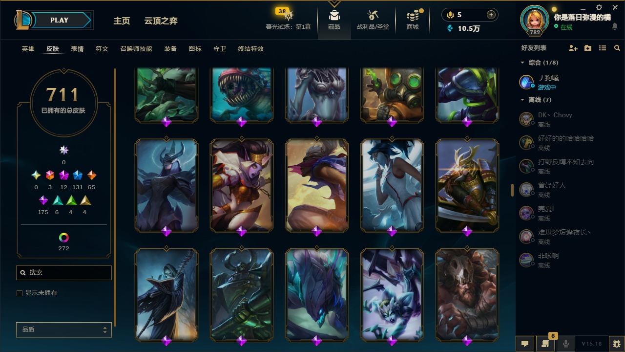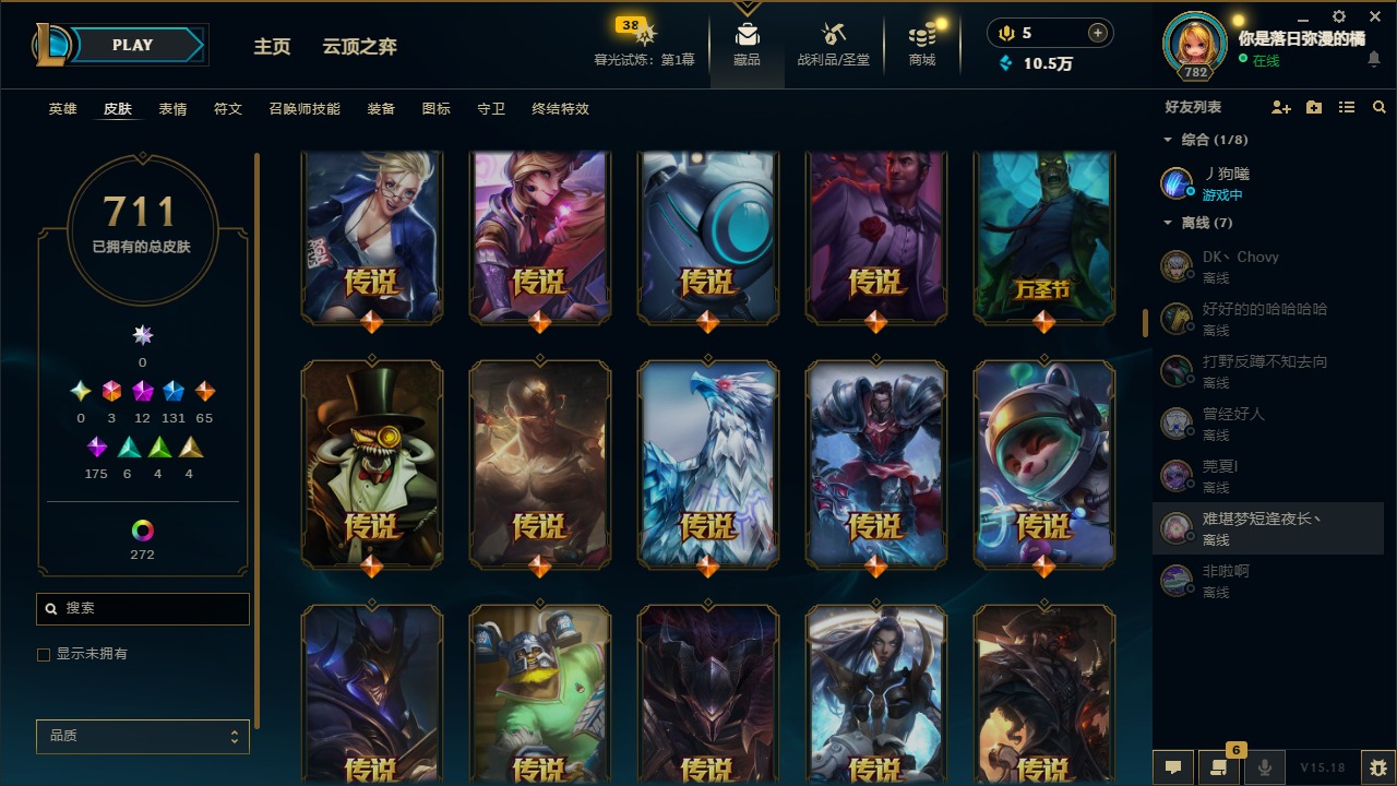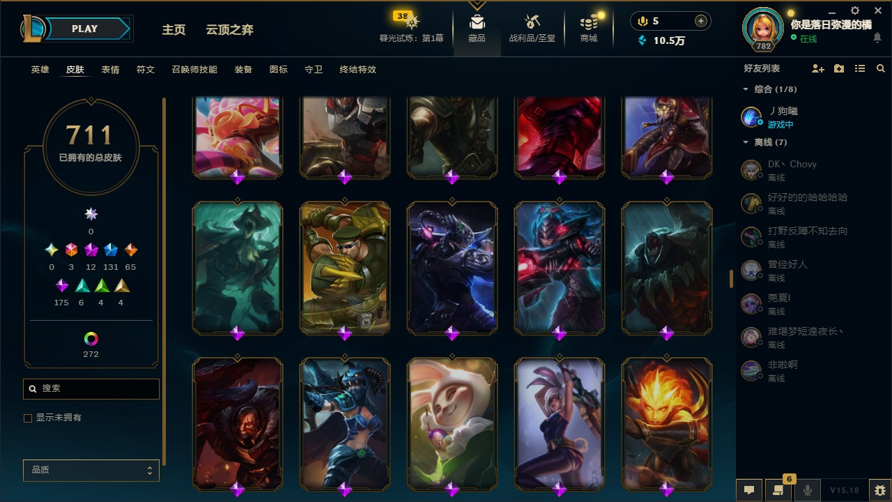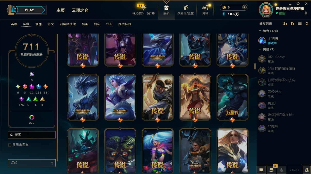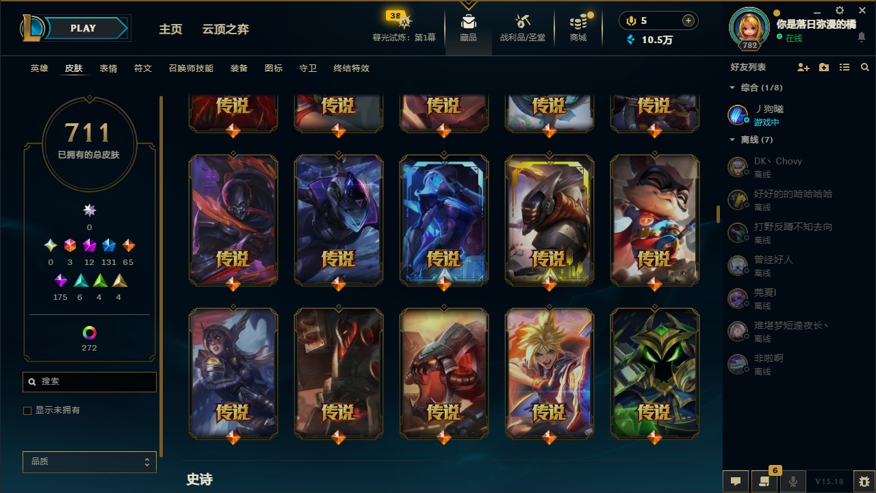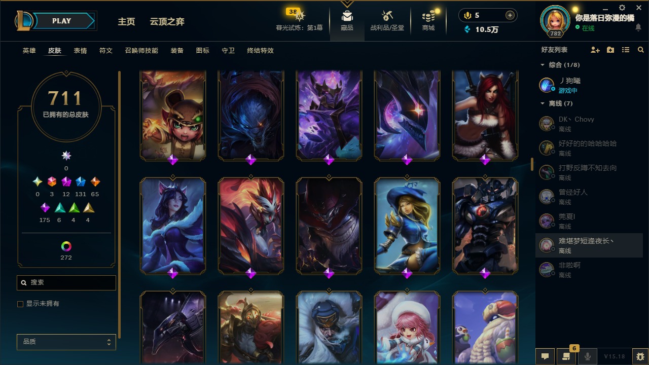 [12281384]3终极 12神话 131限定 65传说 175史诗 711皮肤 301炫彩 168英雄 可二次 可修改实名 优质装备:至臻 玉剑传说 武剑仙,至臻 战斗学院 拉克丝,至臻 K/DA 卡莎,至臻 星之守护者 妮寇,至臻 女帝 黛安娜,穿星魔锋,斩星魔剑,防爆天使 凯尔,暗影 沃里克,巧克力工坊 波比,创世纪 希维尔,地底世界 崔斯特,电玩战魂 人马,都铎王朝 图奇,防爆士兵 炼金,防爆士兵 格雷福斯,钢铁之翼 凤凰,冠军典狱长 锤石,冠军掠夺者 卡兹克,冠军之箭 艾希,冠军之矛 滑板鞋,冠军之刃 锐雯,冠军之刃 锐雯 2016,冠军之隐 劫,警用试作体K-9 内瑟斯,密林猎手 提莫,诺斯费拉图 弗拉基米尔,野兽猎人 德莱文,野兽猎人 瑟庄妮,野兽猎人 泰达米尔,勇者 阿狸,御魔星矢 寒冰,战场BOSS 吉格斯,至臻 星之守护者 艾克,大元素使,灵魂守卫,未来战士,2022 全球总决赛 阿兹尔,至臻 星之守护者 妮蔻,雾雨之刃 锐雯,冠军之刃 锐雯 2016 凯旋圣装,冠军掠夺者 卡兹克 凯旋圣装,弹幕天使 卡莎 炽天使·公正,冠军之血 希瓦娜 凯旋圣装,无畏骑士 瑟庄妮 赤子初心,外星装甲 库奇,星之守护者 金克丝 黑洞,冠军之隐 劫 凯旋圣装,至臻 星之守护者 妮蔻(2022),至臻 玉剑传说 武剑仙(2022),至臻 战斗学院 拉克丝(2022),净雪之月 莫甘娜 冬虹,银龙裁夬 泰隆 潜龙在渊,墨之影武者 亚索 金墨耀影,战斗学院 盖伦 不死鸟,十五周年纪念 希维尔,心之钢 伊泽瑞尔 天纵才华,魔女 阿卡丽 虚荣,北极星钢影 卡蜜尔 智慧纽带,幻灵战斗兔 阿萝拉 梦幻强袭,魅影之刃 锐雯,暗裔英雄 盖伦 海克斯:摄魂 薇恩 限定:奥斯曼大帝 普朗克,创星之灵 璐璐,舞会公主 安妮 情人节限定:觅心猎手 薇恩,觅心魔灵 奥利安娜,觅心女王 寒冰,甜心之翎 洛,甜心之羽 霞 赛季限定皮:胜利凤凰 艾尼维亚,胜利剑圣 易,胜利女神 娑娜,胜利巨口 克格莫,胜利之王 泰达米尔,胜利女神 莫甘娜,胜利女神 希维尔,胜利之树 茂凯,胜利之剑 剑魔,胜利枪神 卢锡安,胜利女神 瑟庄妮 冠军限定系列:S13 T1 李青,S1FNC 酒桶,S1FNC 迦娜,S1FNC 嘉文四世,S1FNC 卡尔萨斯,S1FNC 库奇,S2 暗杀星 蒙多,S2 暗杀星 努努,S2 暗杀星 慎,S