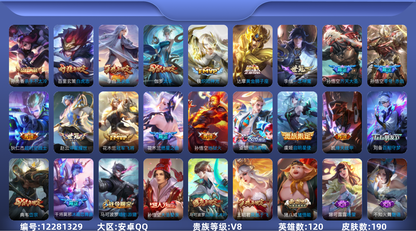 [12281329]【商品标题】:安卓Q-V8-永恒钻石I段位-120英雄-190皮肤-1典藏-0珍品无双-0无双-0珍品传说-16传说-62史诗
