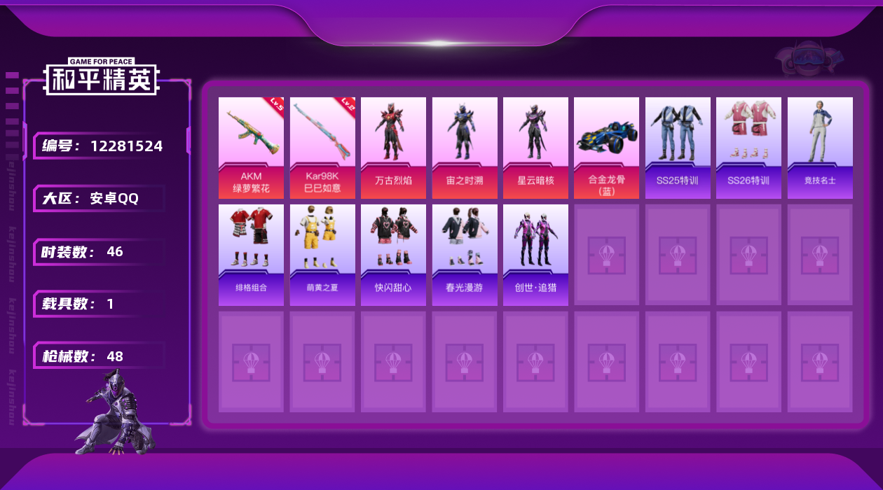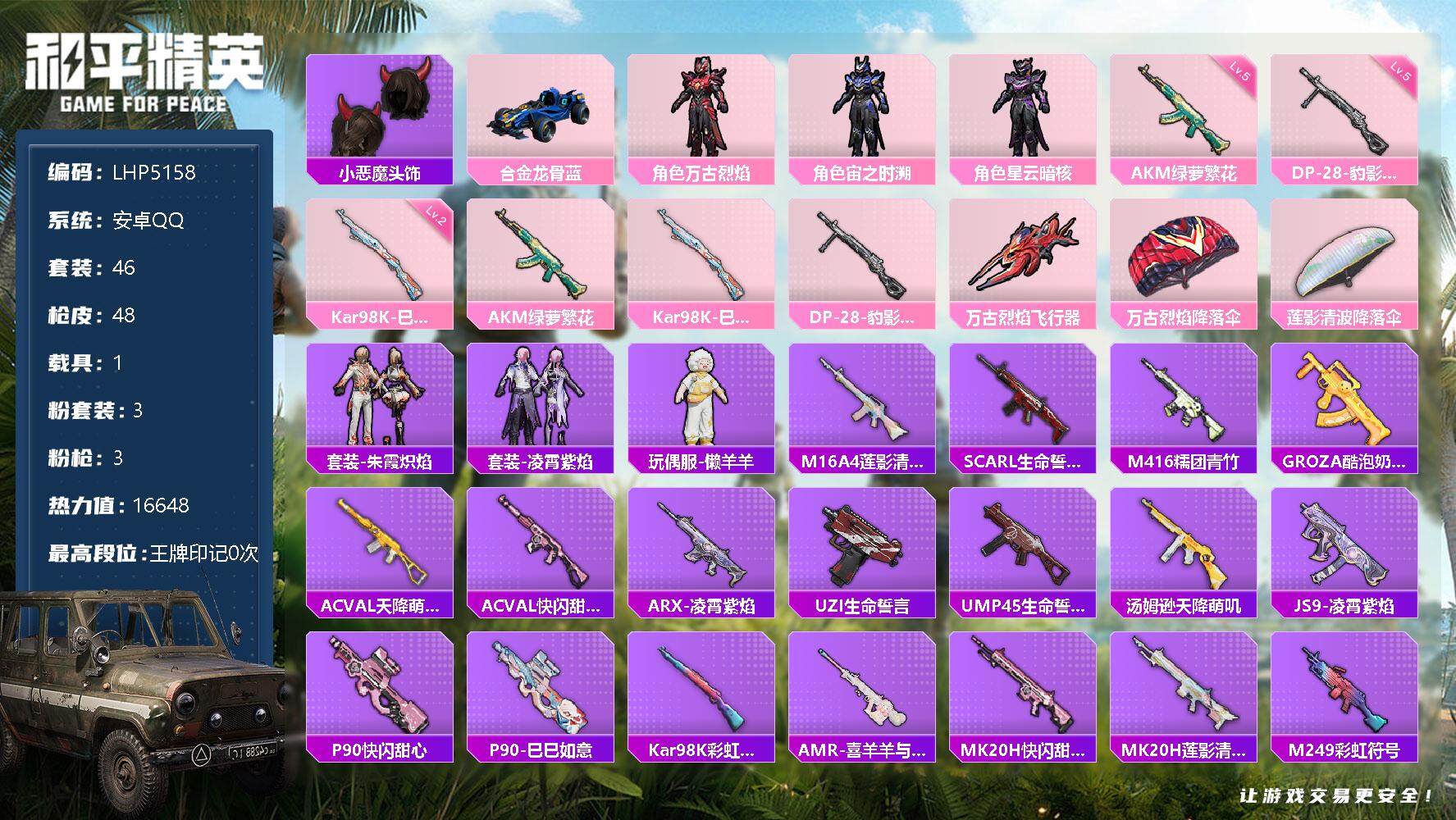 [12281524]【特价急出/详情看图】:安卓 手Q-3粉装-3特效枪-1载具-1粉色飞行器-1.6w热力值-2王牌印记-46套装-48枪皮【热门品类】:小恶魔头饰【粉色载具】:合金龙骨(蓝)【粉色套装】:角色-万古烈焰,角色-宙之时溯,角色-星云暗核【粉色枪皮等级】:AKM-绿萝繁花(五级),Kar98K-巳巳如意(二级),DP-28-豹影疾电(五级)【粉色飞行器】:万古烈焰飞行器