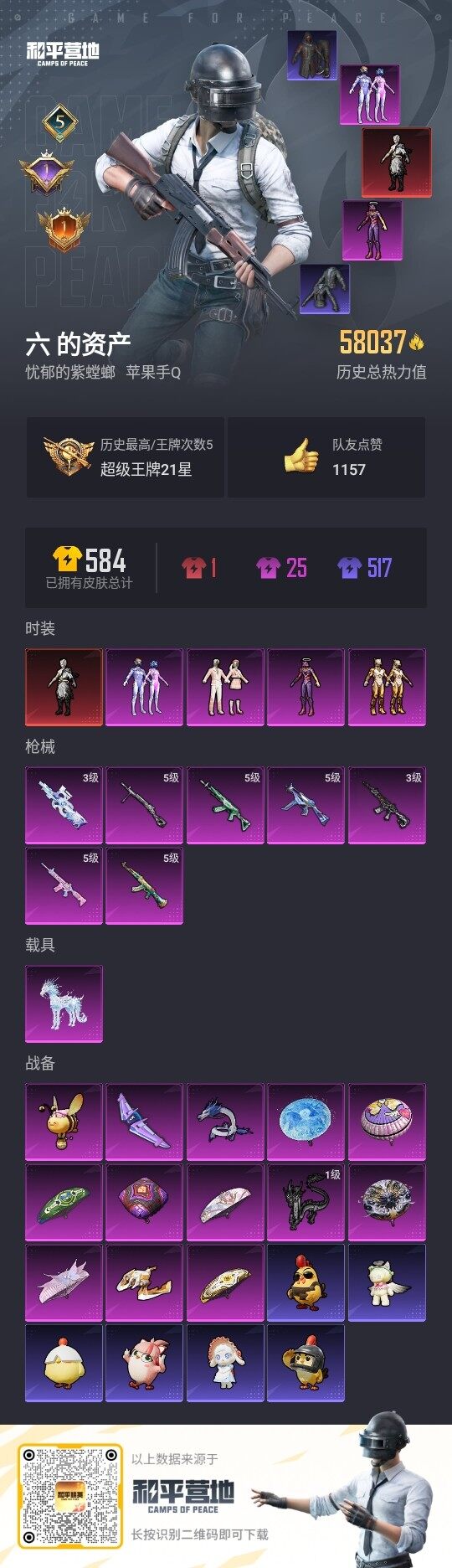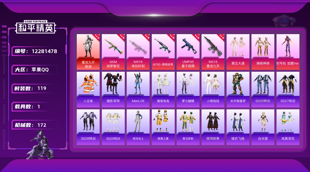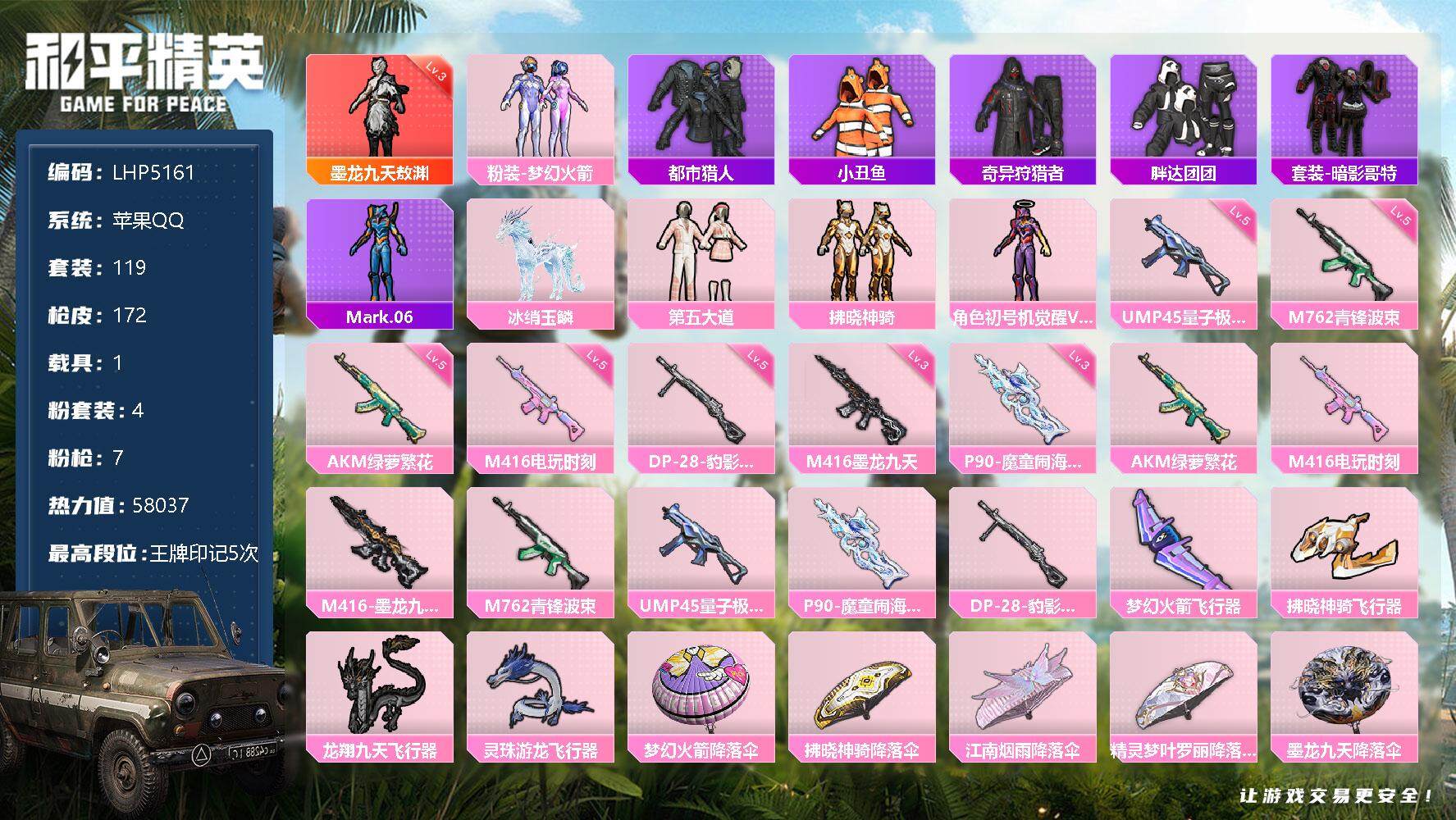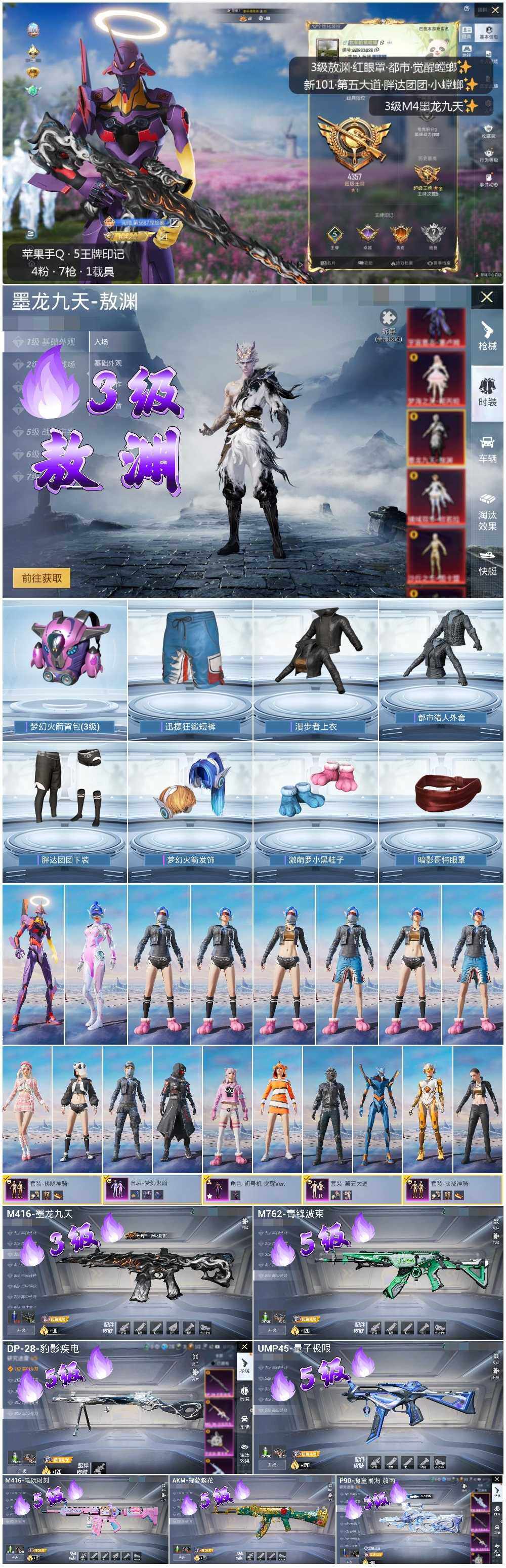 [12281478]素材身法号【特价急出/详情看图】:苹果 手Q-1神装-4粉装-7特效枪-1载具-5粉色飞行器-5.8w热力值-5王牌印记-119套装-172枪皮【红色神装等级】:墨龙九天-敖渊(三级)【热门品类】:粉装-梦幻火箭,套装-都市猎人,套装-小丑鱼,套装-奇异狩猎者,套装-胖达团团,套装-暗影哥特,角色-Mark.06【粉色载具】:冰绡玉鳞【粉色套装】:粉装-梦幻火箭,粉装-第五大道,粉装-拂晓神骑,角色-初号机 觉醒Ver.【粉色枪皮等级】:AKM-绿萝繁花(五级),M416-电玩时刻(五级),M416-墨龙九天(三级),M762-青锋波束(五级),UMP45-量子极限(五级),P90-魔童闹海 敖丙(三级),DP-28-豹影疾电(五级)【粉色枪皮】:AKM-绿萝繁花,M416-电玩时刻,M416-墨龙九天,M762-青锋波束,UMP45-量子极限,P90-魔童闹海 敖丙,DP-28-豹影疾电【粉色飞行器】:梦幻火箭飞行器,拂晓神骑飞行器,龙翔九天飞行器,灵珠游龙飞行器