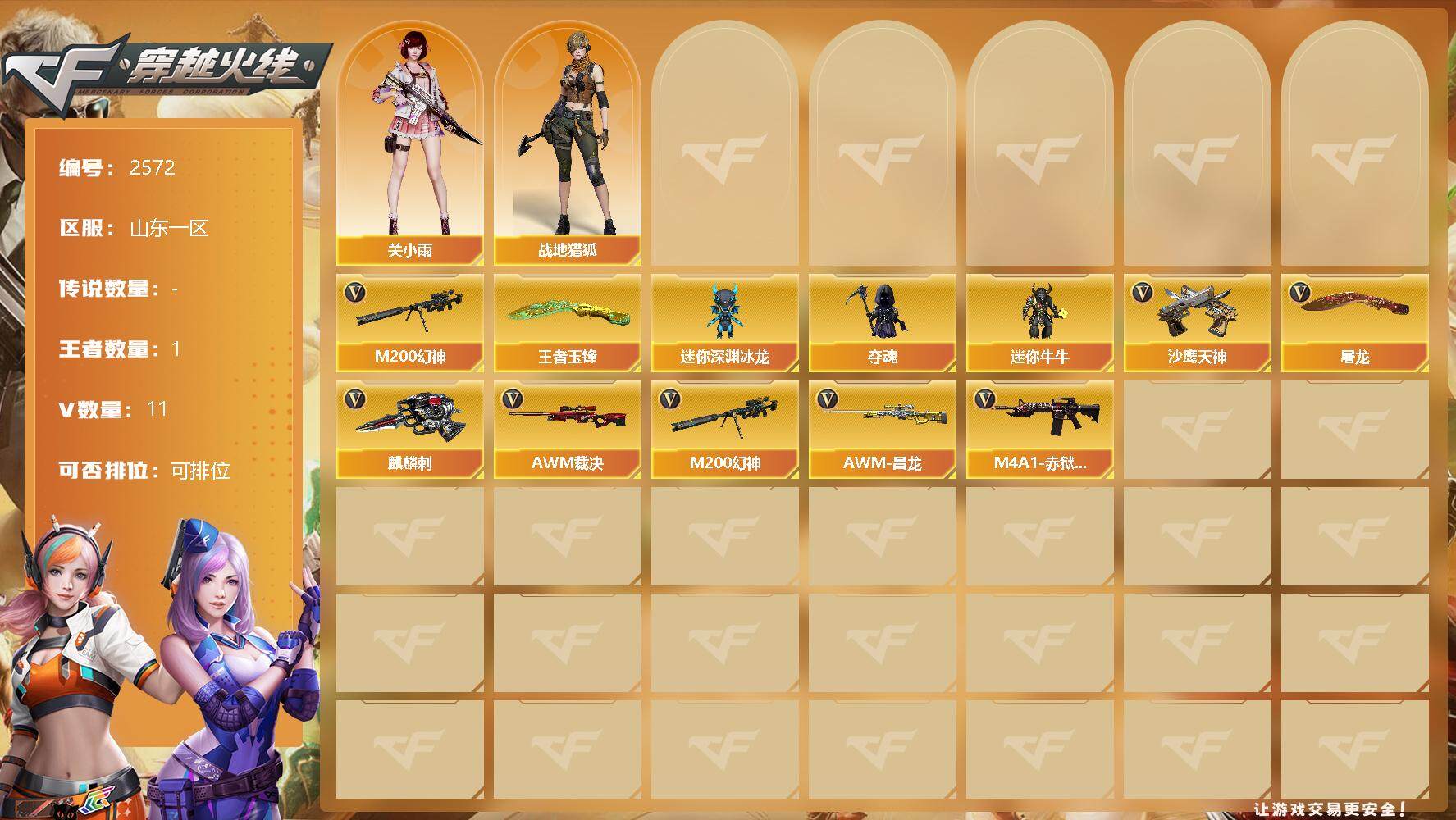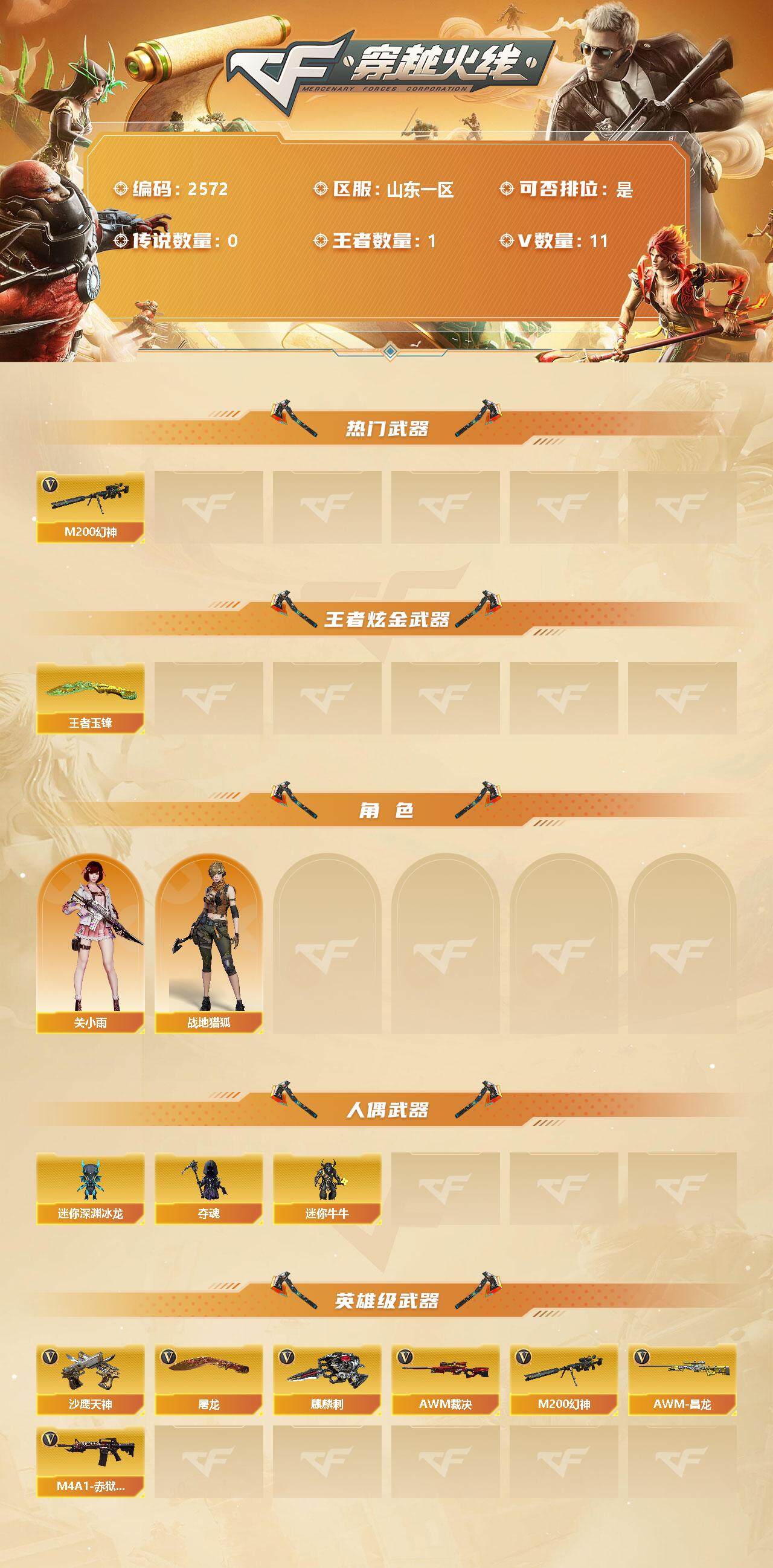 [12281445]【商品标题】:山东一区-11V-1王者-0炫金 【热门武器】:M200-幻神 【王者炫金武器】:王者玉锋 【角色】:关小雨,战地猎狐 【人偶武器】:迷你深渊冰龙,夺魂,迷你牛牛 【英雄级武器】:AWM-裁决,M200-幻神,AWM-昌龙,M4A1-赤狱骑士,沙鹰-天神,麒麟刺,屠龙 【特殊枪械】: